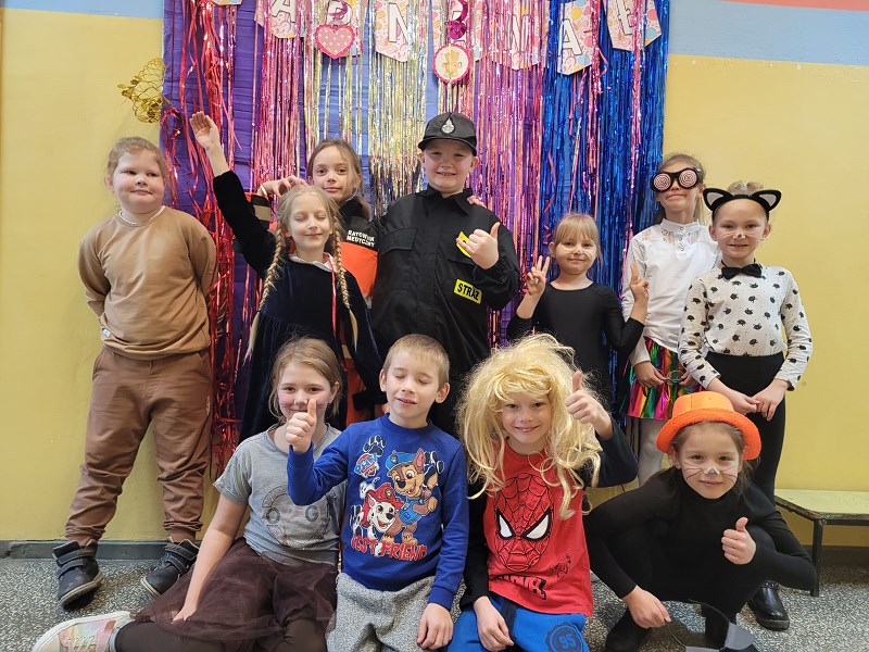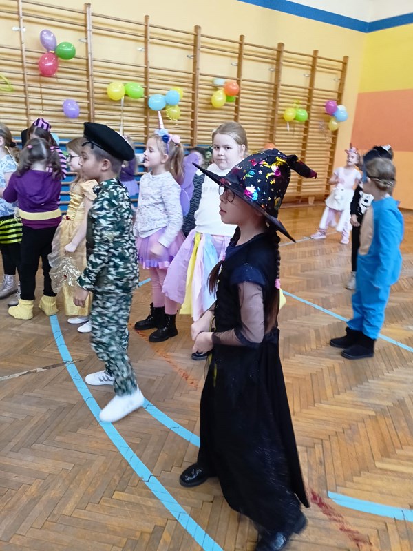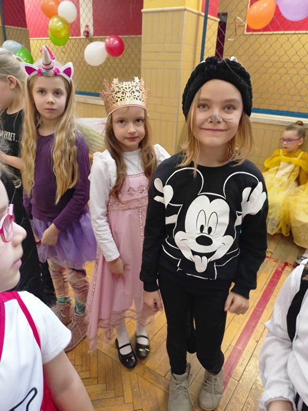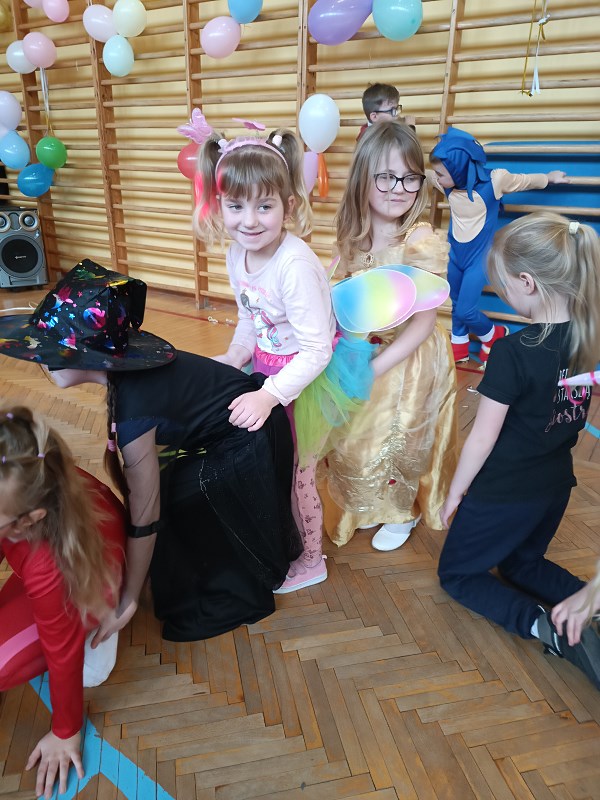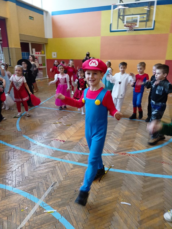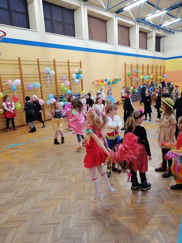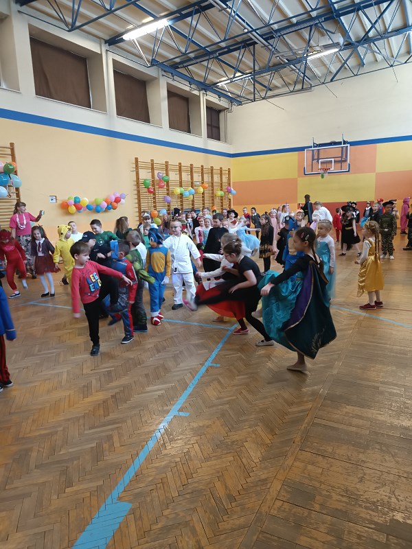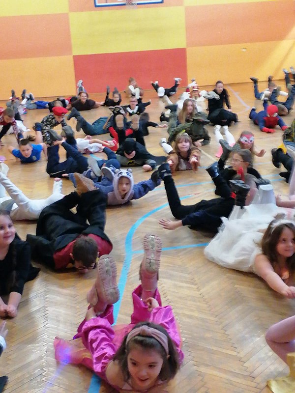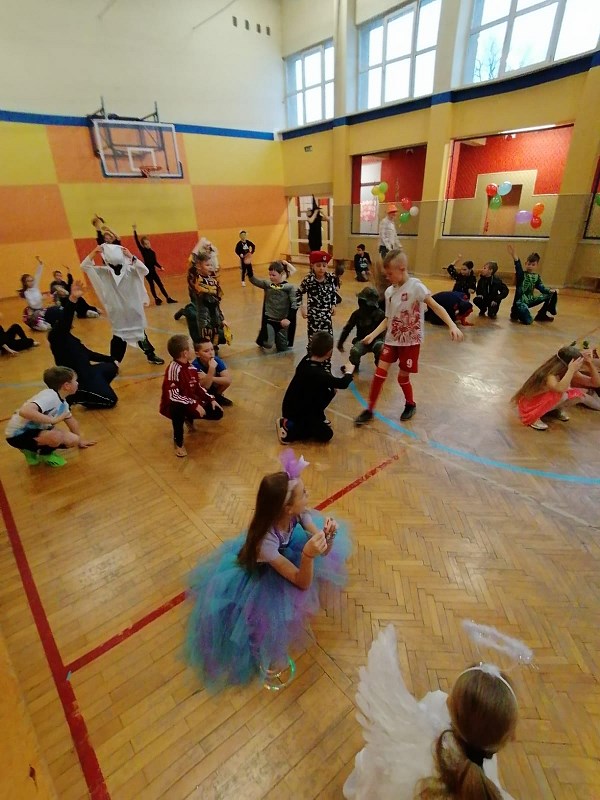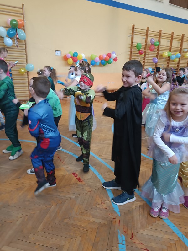 24 stycznia od rana pojawiały się kolorowe postacie. Dzieci z klas 0-3 zamieniały się w królewny, księżniczki, wróżki, super bohaterów, piratów, rycerzy…można długo wymieniać. Podczas balu prowadzonego przez animatora, wszystkie dzieci tańczyły w rytm znanych i lubianych przebojów.