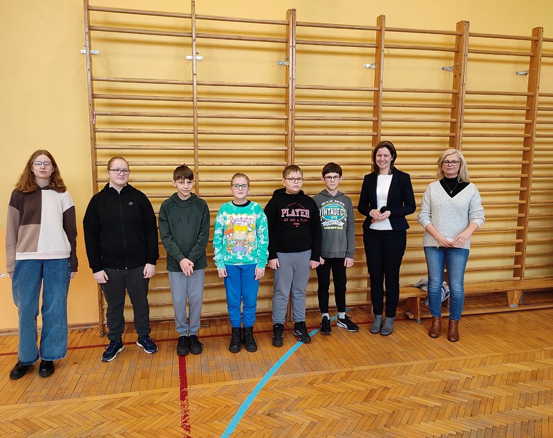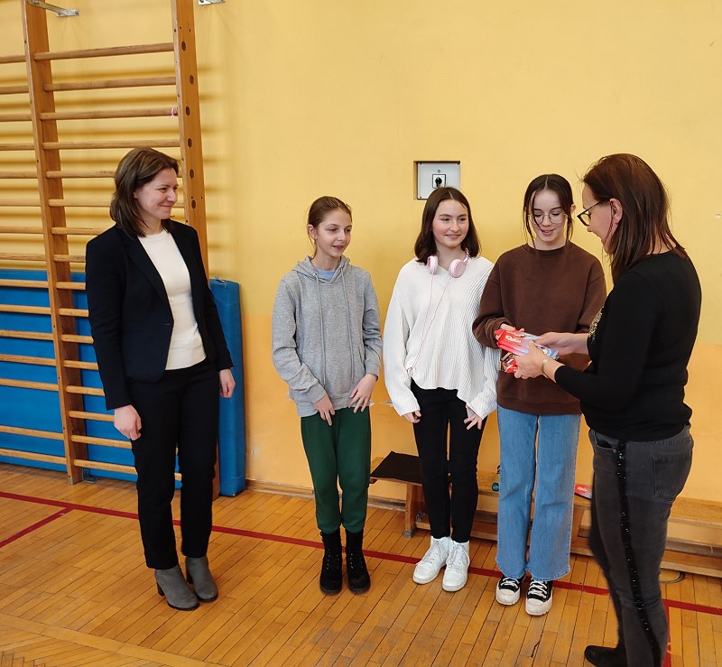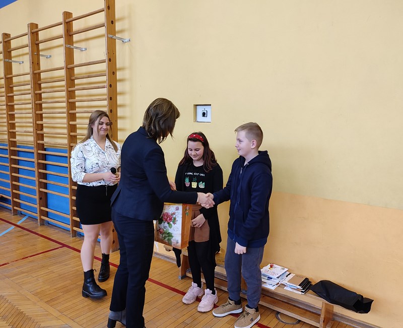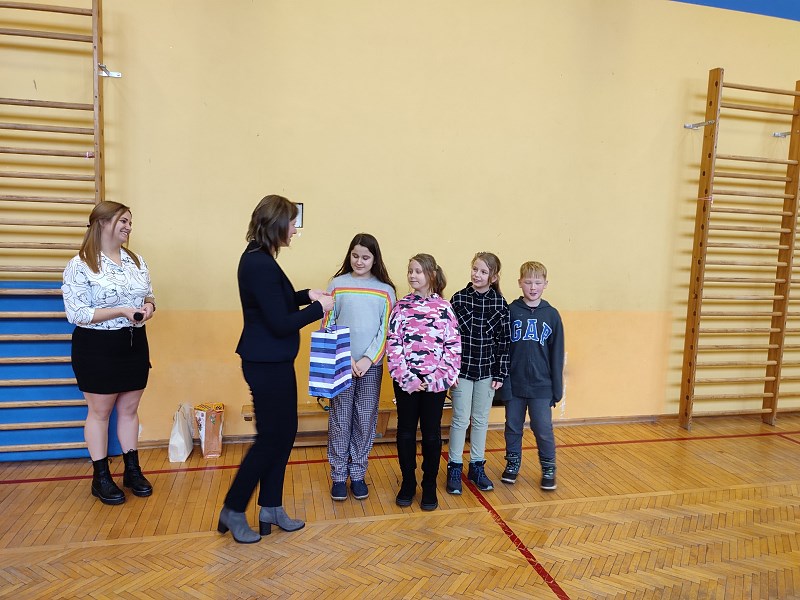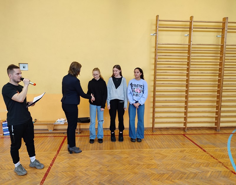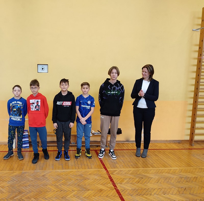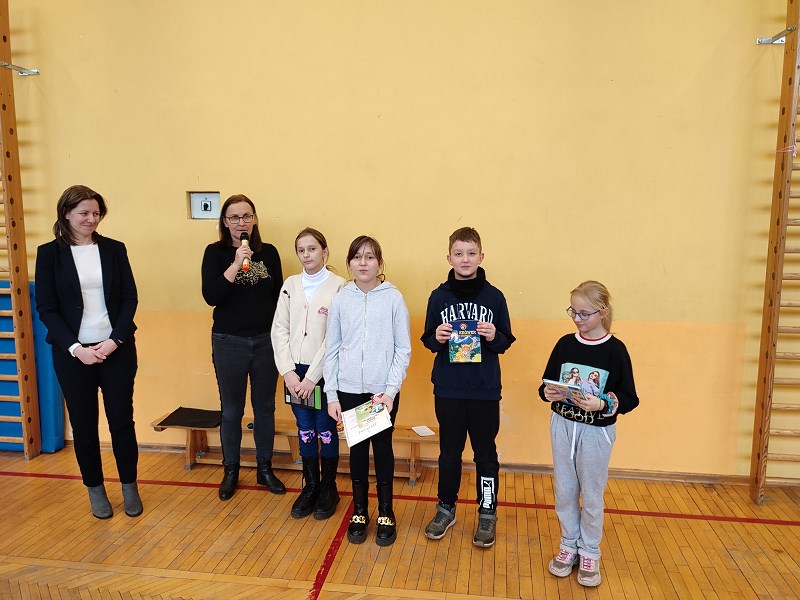 Wyróżnieni zostali uczniowie, którzy osiągnęli bardzo dobre wyniki w nauce i podparli je wzorowym zachowaniem. Ważne i motywujące były słowa Pani Dyrektor, Kamilli Kwiręg, która, gratulując wzorowym uczniom, stwierdziła, że wszyscy w szkole pracowali na miarę swoich możliwości i nikt nie szczędzili sił, by zakończyć semestr jak najlepiej, więc każdy zasługuje na pochwałę. Podziękowania otrzymali także nauczyciele za swój wkład w uczniowskie sukcesy. Brawa od rówieśników odebrali uczniowie, którzy zakwalifikowali się do rejonowych etapów olimpiad przedmiotowych oraz Michał i Kirylo, którzy już wkrótce będą brali udział w ogólnopolskim etapie konkursu Instalogik. Ale to nie koniec sukcesów! Na dłuższą chwilę głos zabrał Pan Łukasz Wit, który wymienił liczne osiągnięcia szkolnych sportowców. I dziewczyny, i chłopcy zdobyli laury w różnych konkurencjach zarówno w powiecie jak i województwie, ale szczególne owacje zebrały dziewczyny, które w biegach przełajowych zajęły 7 miejsce w Polsce. Nagrody odebrały też klasy, które wykazały się największą wiedzą o patronce naszej szkoły, wykonując w Dniu Patrona -Marii Skłodowskiej-Curie zadania przygotowane przez Pana Jerzego Baranowskiego (nauczyciel fizyki) i Panią Urszulę Dominak (nauczycielka chemii). W zdobywaniu wiedzy z różnych dziedzin pomaga czytanie książek, o czym przekonują podopiecznych głównie polonistki, ale także inni nauczyciele, a wśród nich bibliotekarka, która zorganizowała kilka konkursów czytelniczych, a ich laureaci na apelu zostali nagrodzeni- oczywiście książkami. Ponieważ na apelowym spotkaniu w sali gimnastycznej nie było najmłodszych uczniów, a to oni są najczęstszymi bywalcami szkolnej biblioteki i najliczniej biorą udział w czytelniczych zmaganiach, nagrody dla zwycięzców z tej grupy zostały wręczone w klasach. Równie ważne, a może i ważniejsze, jak uczenie się i czytanie, jest bezpieczeństwo, dlatego Pani Dyrektor serdecznie podziękowała grupie Joanitów, którzy pod kierunkiem Pani Urszuli Dominiak dbali o nasz bezpieczny pobyt w szkole i w razie drobnych urazów udzieli potrzebującym pierwszej pomocy.