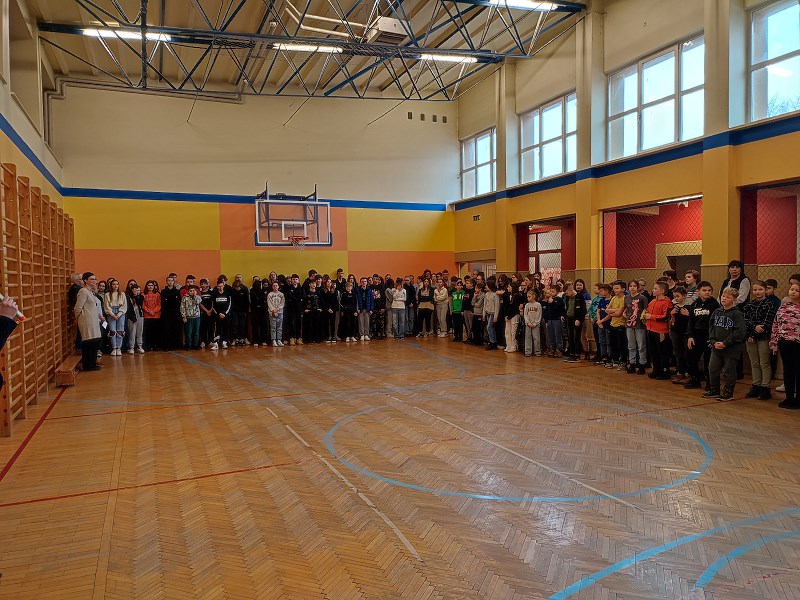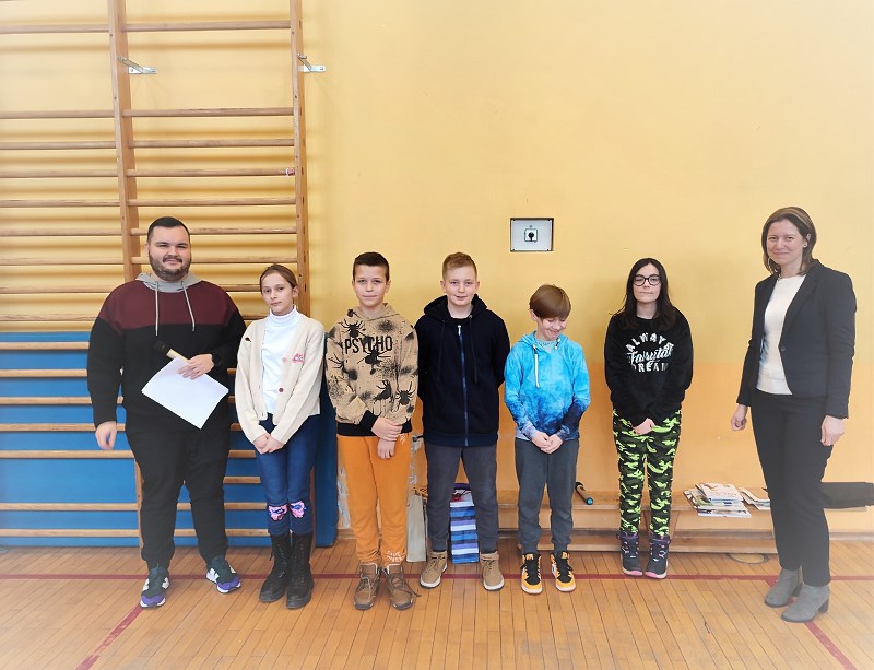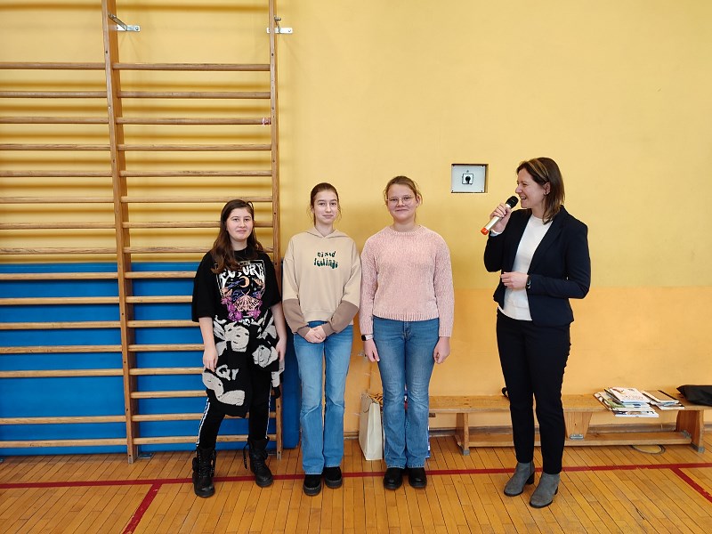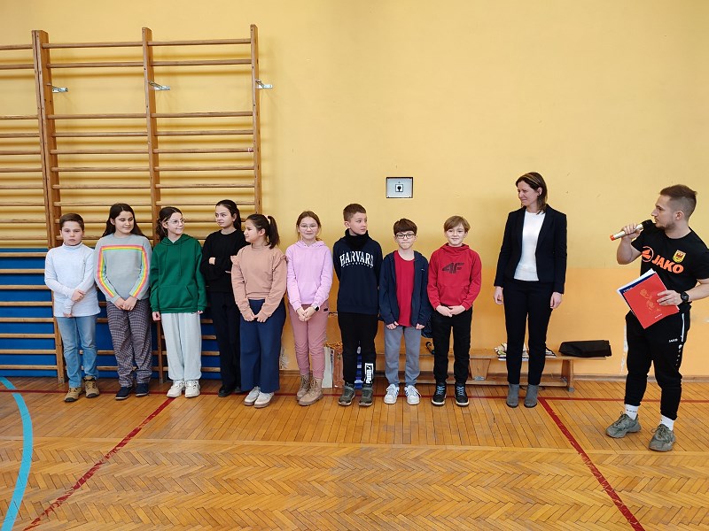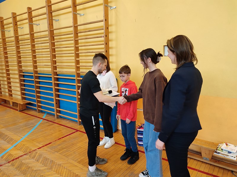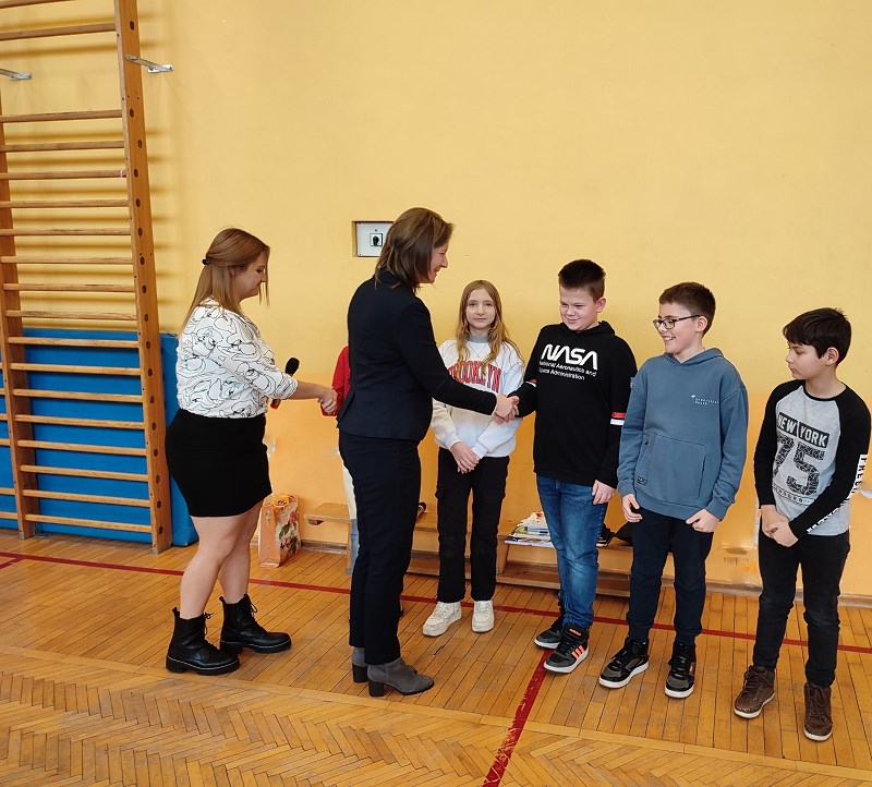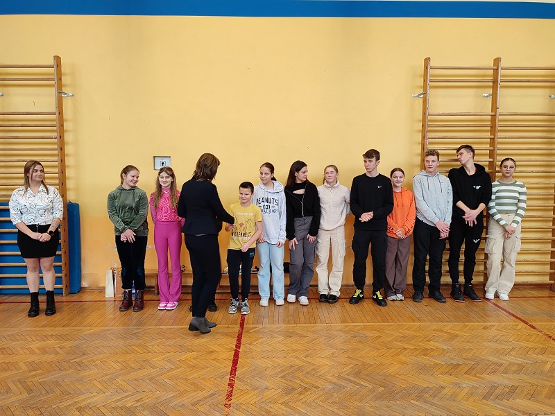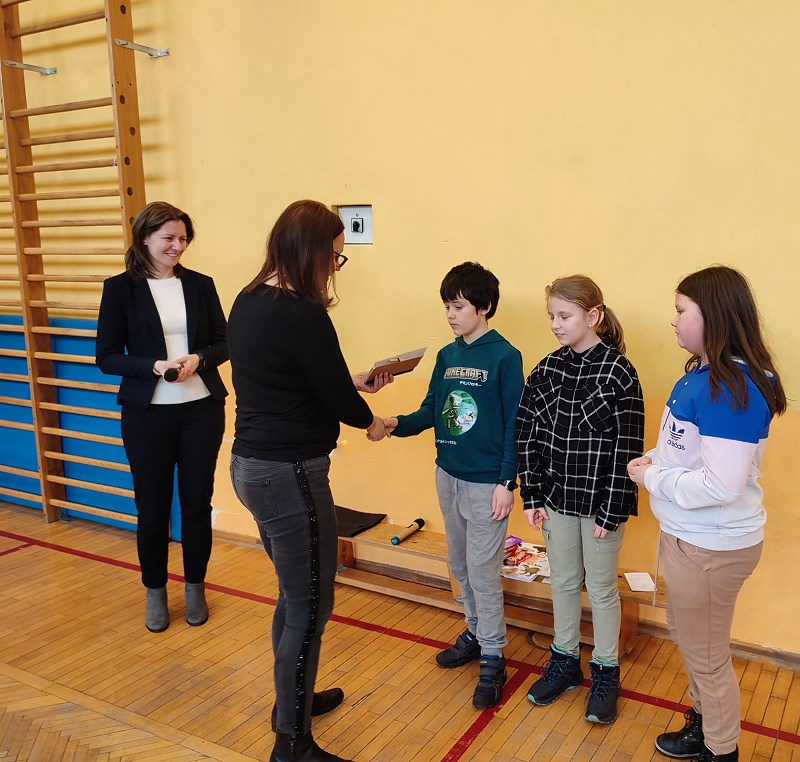 Wyróżnieni zostali uczniowie, którzy osiągnęli bardzo dobre wyniki w nauce i podparli je wzorowym zachowaniem. Ważne i motywujące były słowa Pani Dyrektor, Kamilli Kwiręg, która, gratulując wzorowym uczniom, stwierdziła, że wszyscy w szkole pracowali na miarę swoich możliwości i nikt nie szczędzili sił, by zakończyć semestr jak najlepiej, więc każdy zasługuje na pochwałę. Podziękowania otrzymali także nauczyciele za swój wkład w uczniowskie sukcesy. Brawa od rówieśników odebrali uczniowie, którzy zakwalifikowali się do rejonowych etapów olimpiad przedmiotowych oraz Michał i Kirylo, którzy już wkrótce będą brali udział w ogólnopolskim etapie konkursu Instalogik. Ale to nie koniec sukcesów! Na dłuższą chwilę głos zabrał Pan Łukasz Wit, który wymienił liczne osiągnięcia szkolnych sportowców. I dziewczyny, i chłopcy zdobyli laury w różnych konkurencjach zarówno w powiecie jak i województwie, ale szczególne owacje zebrały dziewczyny, które w biegach przełajowych zajęły 7 miejsce w Polsce. Nagrody odebrały też klasy, które wykazały się największą wiedzą o patronce naszej szkoły, wykonując w Dniu Patrona -Marii Skłodowskiej-Curie zadania przygotowane przez Pana Jerzego Baranowskiego (nauczyciel fizyki) i Panią Urszulę Dominak (nauczycielka chemii). W zdobywaniu wiedzy z różnych dziedzin pomaga czytanie książek, o czym przekonują podopiecznych głównie polonistki, ale także inni nauczyciele, a wśród nich bibliotekarka, która zorganizowała kilka konkursów czytelniczych, a ich laureaci na apelu zostali nagrodzeni- oczywiście książkami. Ponieważ na apelowym spotkaniu w sali gimnastycznej nie było najmłodszych uczniów, a to oni są najczęstszymi bywalcami szkolnej biblioteki i najliczniej biorą udział w czytelniczych zmaganiach, nagrody dla zwycięzców z tej grupy zostały wręczone w klasach. Równie ważne, a może i ważniejsze, jak uczenie się i czytanie, jest bezpieczeństwo, dlatego Pani Dyrektor serdecznie podziękowała grupie Joanitów, którzy pod kierunkiem Pani Urszuli Dominiak dbali o nasz bezpieczny pobyt w szkole i w razie drobnych urazów udzieli potrzebującym pierwszej pomocy.