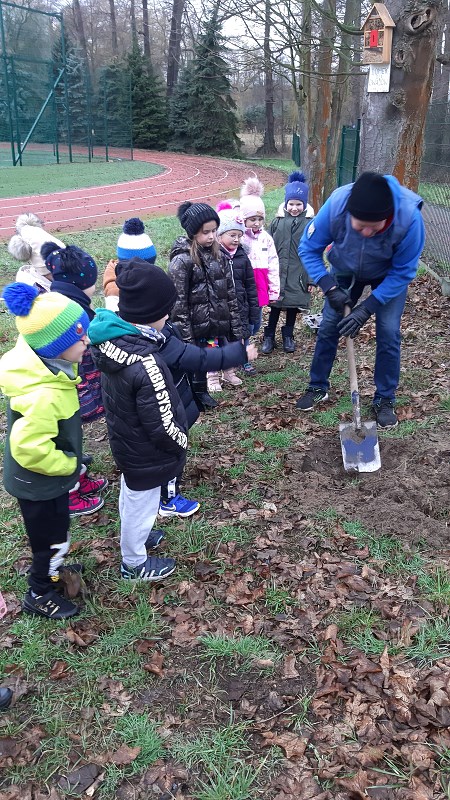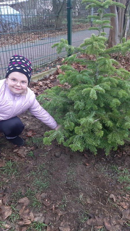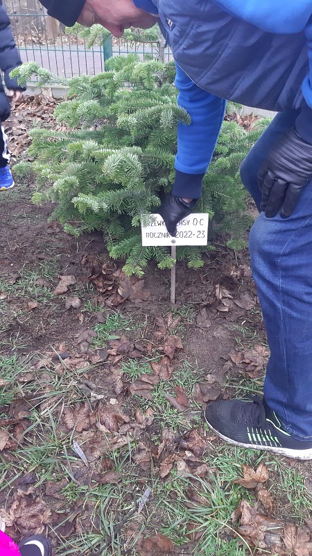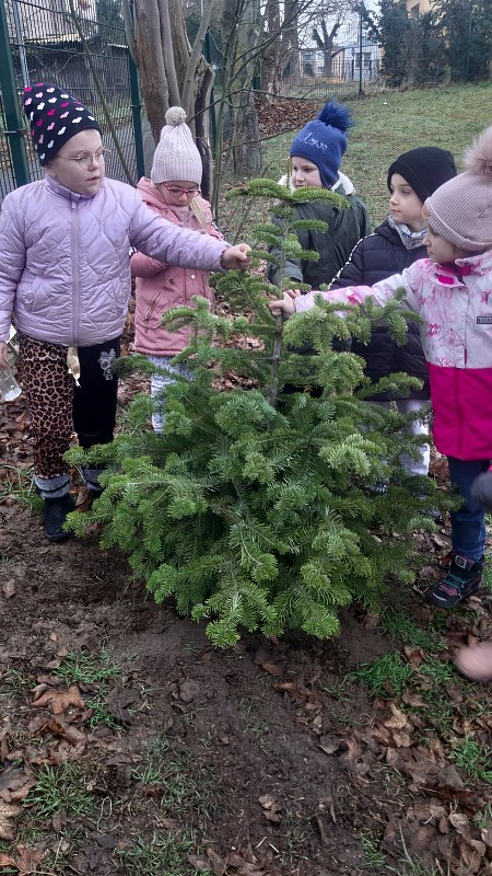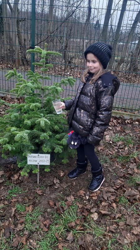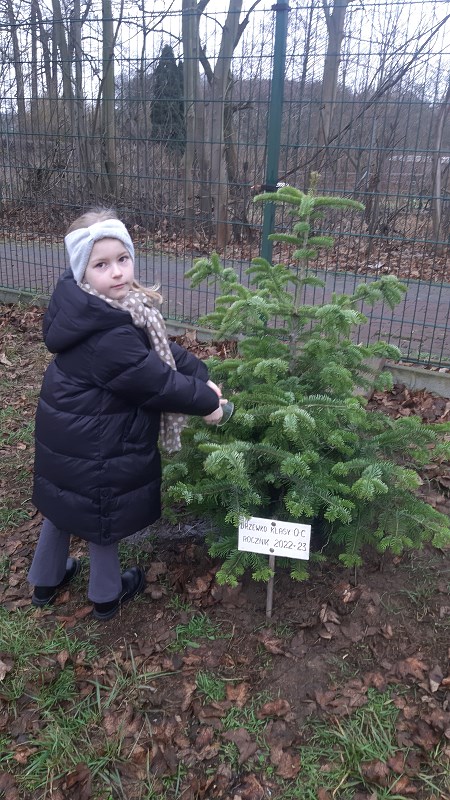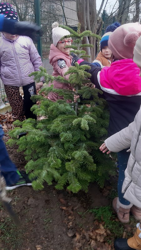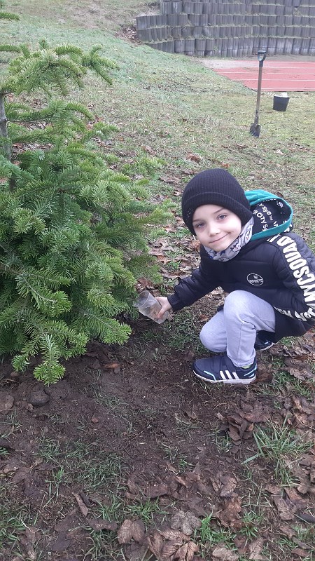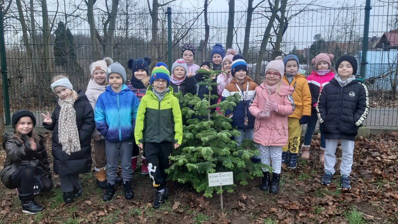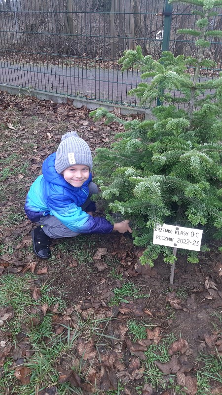 Przed świętami Bożego Narodzenia, dzieci z klasy 0c otrzymały od Pana leśniczego Pawła Ciechanowicza, piękne drzewko iglaste. Czas świąt minął, a dzieci wraz ze swoją panią wychowawczynią, postanowiły posadzić drzewko na terenie wokół szkoły.