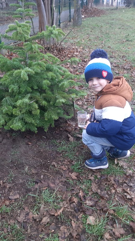 Wyposażeni w odpowiednie narzędzia wyruszyliśmy na boisko szkolne, gdzie wśród innych drzew postanowiliśmy posadzić naszą choineczkę. Każde dziecko miało swój udział w tym ważnym wydarzeniu - każdy podsypywał ziemię pod drzewkiem i je podlewał.
