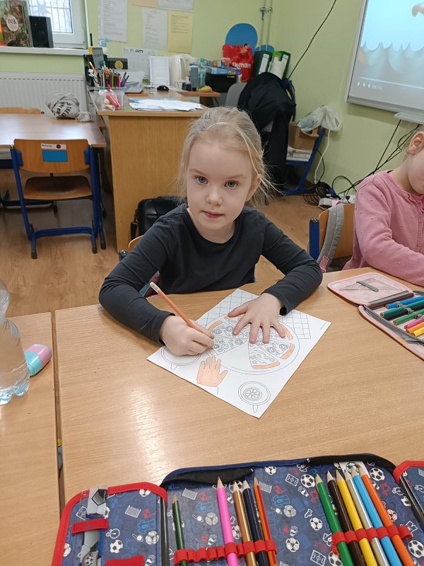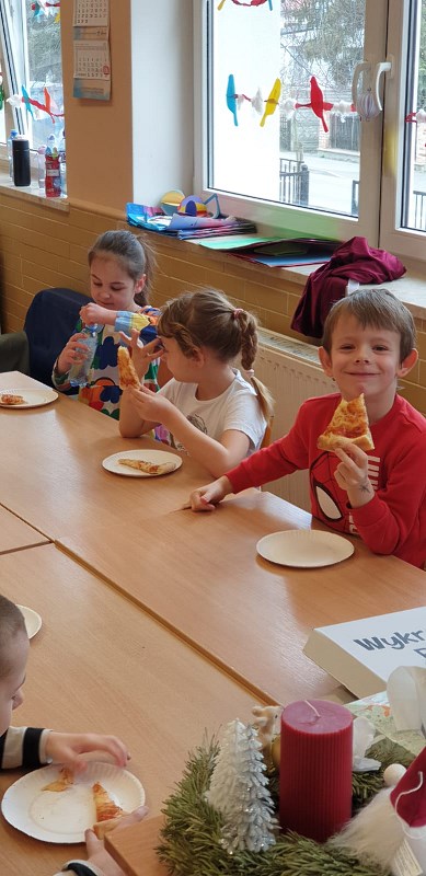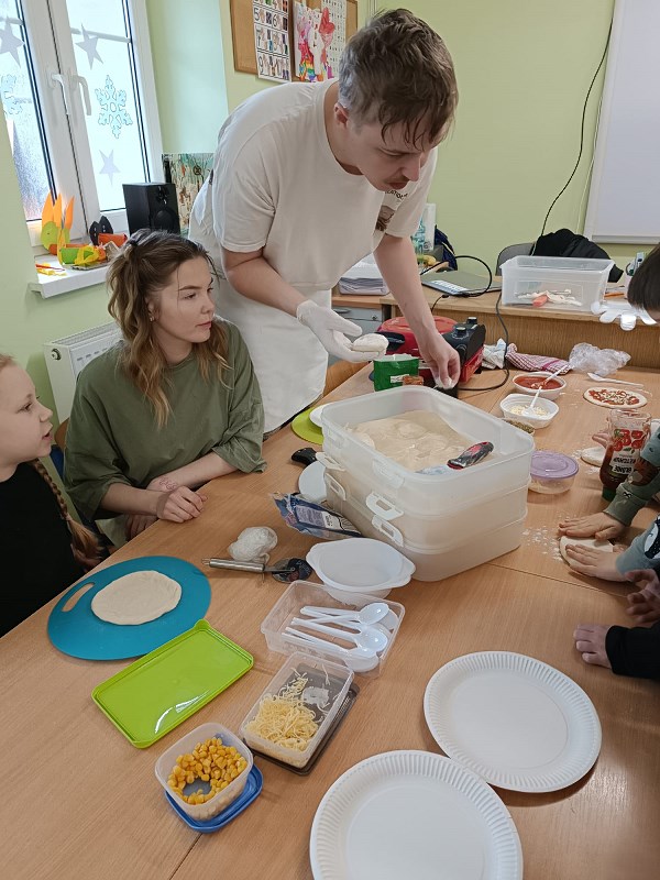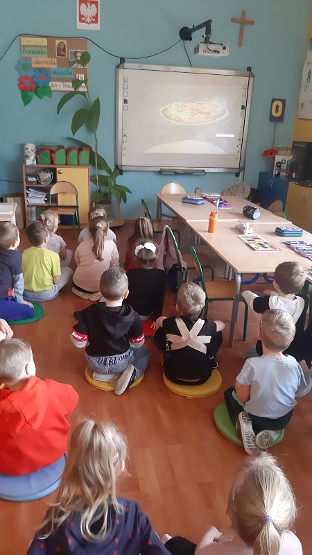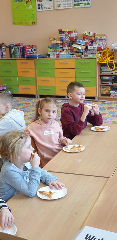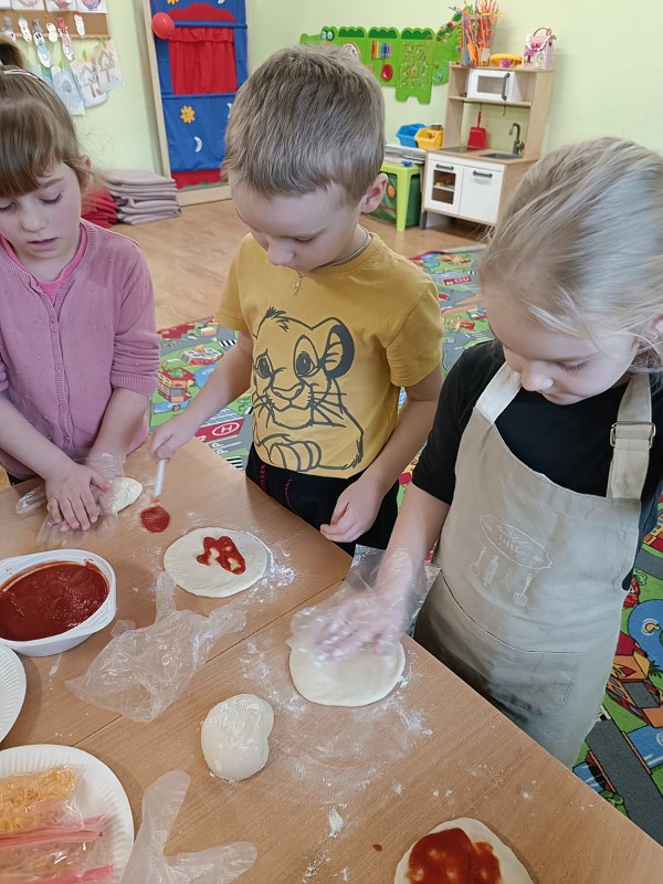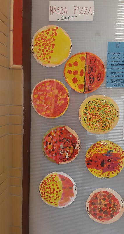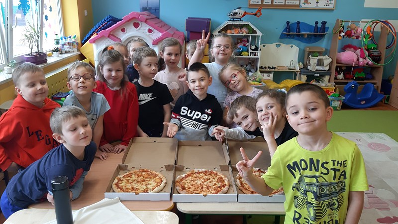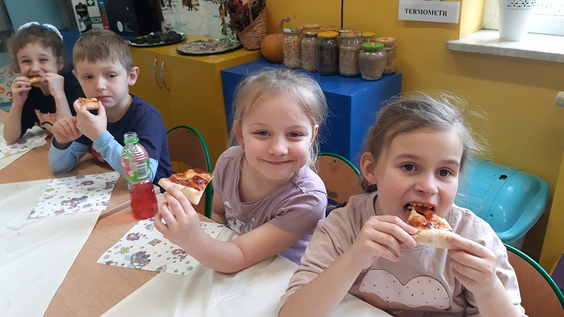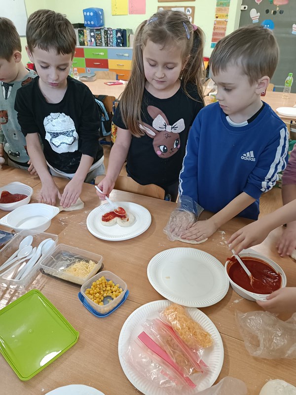 Dzieci z zerówek znają zasady zdrowego odżywiania i wiedzą, że pizza nie jest najzdrowszym daniem, ale... od czasu do czasu możemy skosztować tego włoskiego przysmaku. Poznając tajniki włoskiej kuchni, za pośrednictwem internetu przenieśliśmy się do prawdziwej włoskiej pizzeri, gdzie pan kucharz pokazał, jak wypieka się prawdziwą, włoską pizzę. W naszej szkole też pojawił się pan kucharz, który zaproponował dzieciom wypiek pizzy. Dzieci same mogły wybrać kształt swojej pizzy oraz udekorować ją ulubionymi warzywami i serem. Żeby poznać różne smaki pizzy, skosztowaliśmy też pizzy, która wypiekana jest w naszym mieście. Wszystkie pizze bardzo dzieciom smakowały, były bardzo aromatyczne i doskonale przyprawione.
