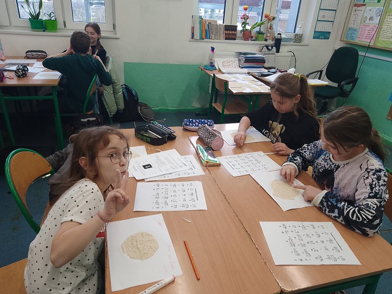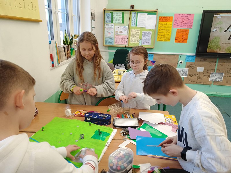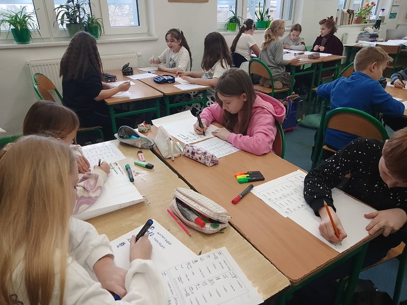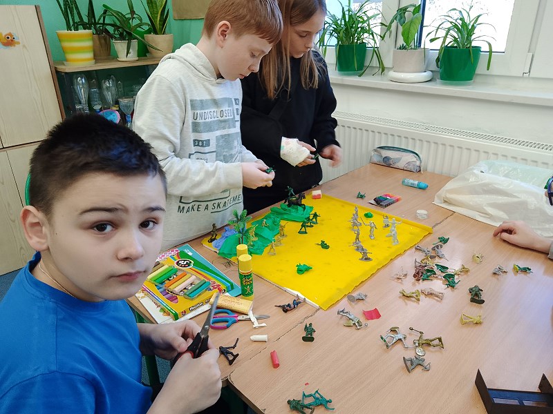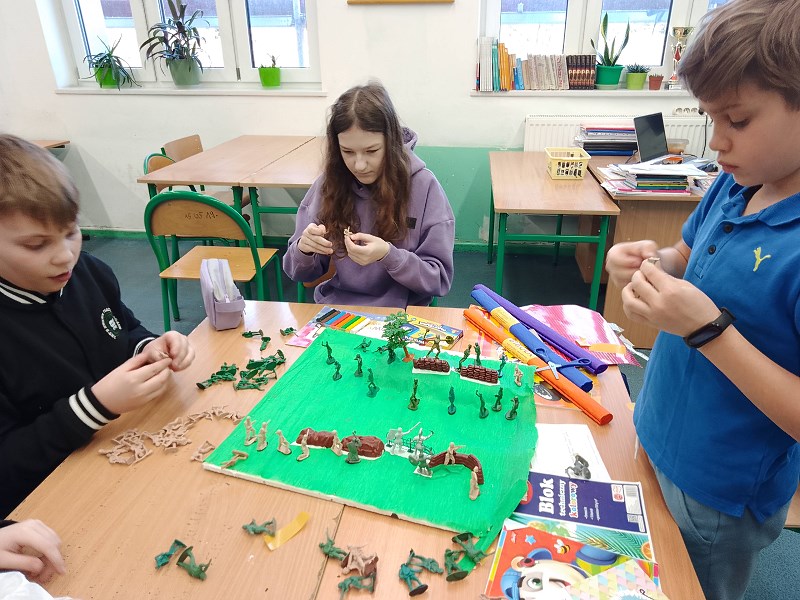 Co jednak zrobić, aby do lekcji o przeszłości przekonać najmłodszych, na przykład dziesięciolatków, którzy po raz pierwszy mają do czynienia z tym przedmiotem? Recepta jest prosta – trzeba z takich zajęć zrobić powód do dobrej zabawy. Klasa 4 a i 4 b ostatnio bardzo chętnie podjęła się takiej formy uczenia historii. Na lekcji o wojnie z Zakonem Krzyżackim tworzyła makiety bitwy pod Grunwaldem, wykorzystując przyniesione pomoce, w tym plastikowe rycerzyki. Widać było, że strategiczne okiełznanie działań bitewnych to domena nie tylko chłopców. Innym razem, w ramach lekcji o Dziejach książki , należało wykonać hieroglificzny zapis na zwojach tak, jak czyniono to w starożytnym Egipcie bądź, posługując się pismem klinowym niczym starożytni Sumerowie, wypełnić tabliczki z masy solnej. Wykonane prace zostały udostępnione szerszej szkolnej publiczności w ramach mini – wystawy.