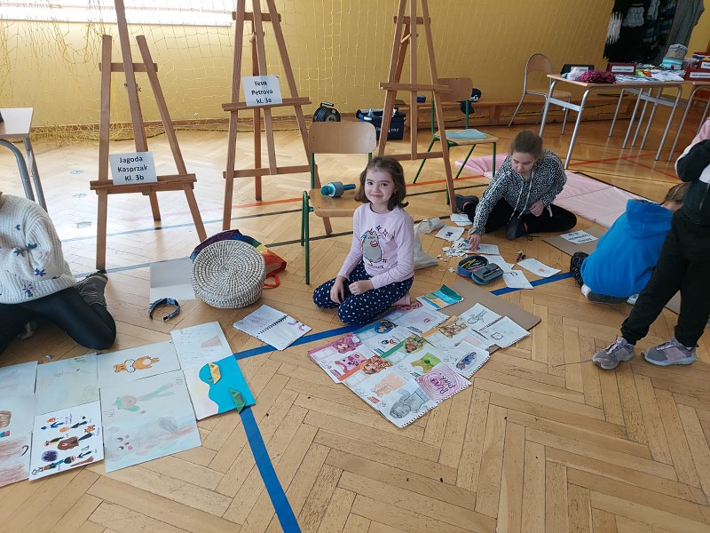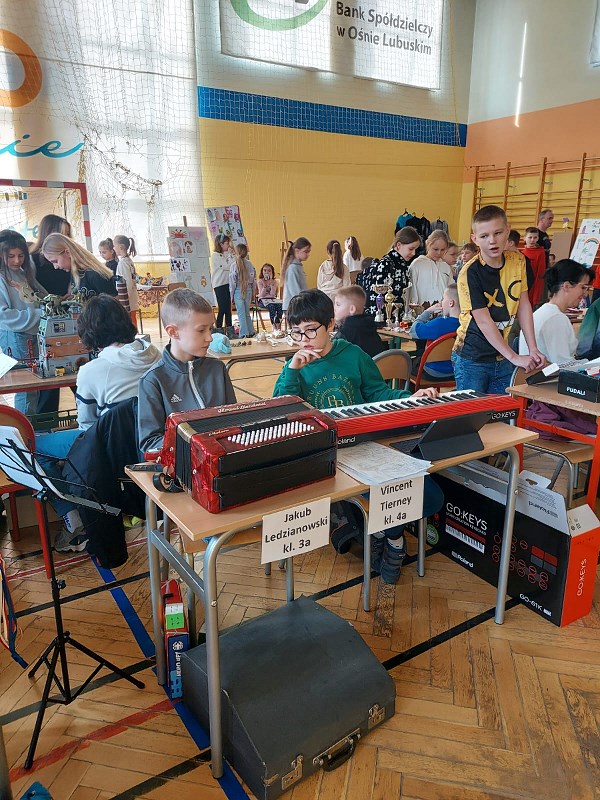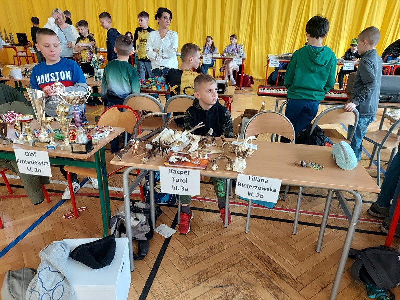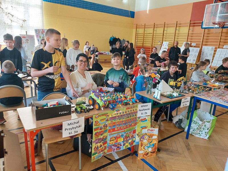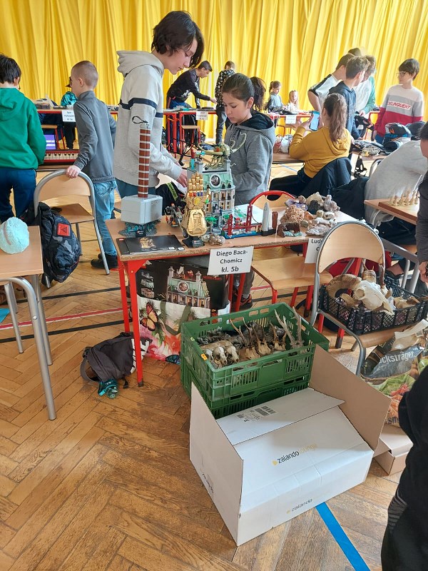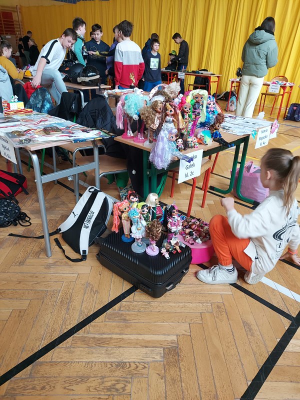 Od samego rana w sali gimnastycznej nasi pasjonaci przygotowywali swoje wystawy. Od godziny 9.00 do 13.00 młodzież, rodzice i nauczyciele opowiadali zwiedzającym o swoich hobby. A można było zobaczyć osiągnięcia sportowe piłkarzy, lekkoatletów, rowerzystów. Pięknie prezentowały się młode amazonki, które przybliżyły kolegom i koleżankom tajniki jazdy konnej. Pokazywane były kolekcje kamieni, poroża, kostki Rubika, karty piłkarskie, niesamowite budowle z klocków lego, monety, zdjęcia odrestaurowanych traktorów, a nawet kolekcje lalek i super zings. Swoje prace udostępnili też artyści – na sztalugach można było podziwiać piękne obrazy, grafiki komputerowe, a przy stolikach piękne, własnoręcznie zrobione laleczki, biżuterię, zwierzątka i makramę. Dodatkowo pojawiły się występy artystyczne dziewcząt ćwiczących gimnastykę artystyczną oraz występy muzyczne chłopców grających na akordeonie i keyboardzie. Pokazane były także kolekcje książek, mangi, akcesoria wędkarskie. Niesamowite wrażenie zrobiły pokazy ju- jitsu, gdzie każdy chętny uczeń mógł spróbować swoich sił z wykwalifikowanym trenerem. Dzisiejszy dzień zrobił ogromne i pozytywne wrażenie na każdym, kto odwiedził salę gimnastyczną.