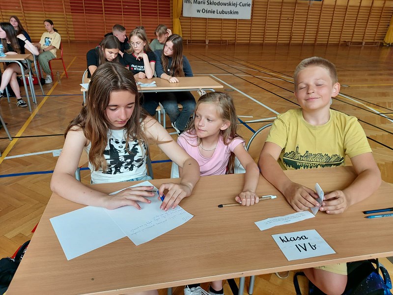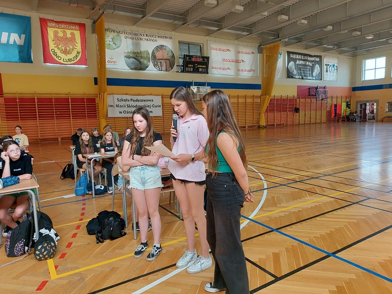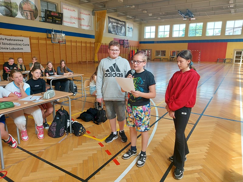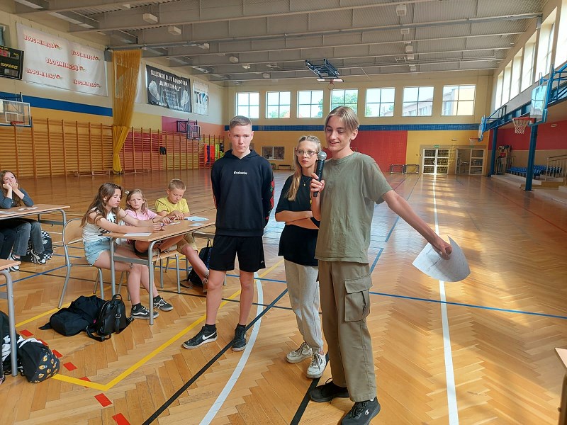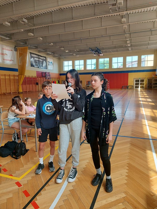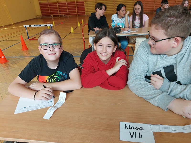 w składzie: p. Krystyna Trzeciak, p. Karolina Olszewska i p. Krzysztof Gurgul czuwali nad właściwym przebiegiem imprezy. Zadaniem uczniów było wykonanie plakatu, rozwiązanie krzyżówki i odpowiedź na dodatkowe pytanie, pokonanie toru przeszkód, odegranie scenki tematycznej oraz znalezienie właściwego rozwiązania w zadaniu problemowym. Wszyscy uczniowie wykazali się wielkim zaangażowaniem w turnieju, podeszli do zadań bardzo rozsądnie
