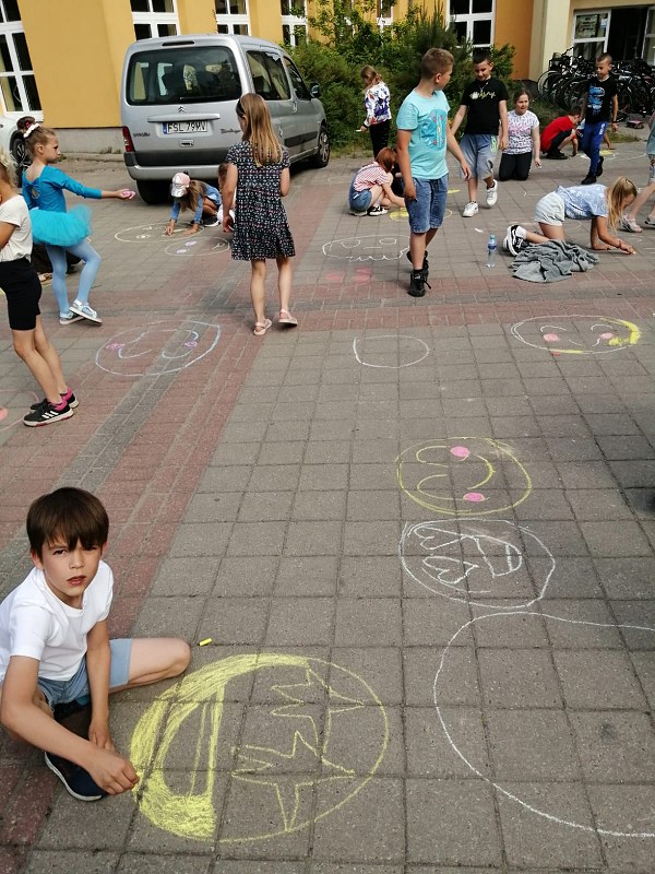 Gdy starsi uczniowie uczestniczyli w turnieju, młodsi dekorowali dziedziniec szkolny. Uczniowie klas 0 – III, pod opieką wychowawców, ozdobili plac przed szkołą kolorowymi emotkami, które symbolizowały pozytywne emocje i uczucia, jakie są w każdym z nas. W międzyczasie odbywały się wybory Króla i Królowej Życzliwości, których wyniki poznamy w najbliższym czasie 😊.