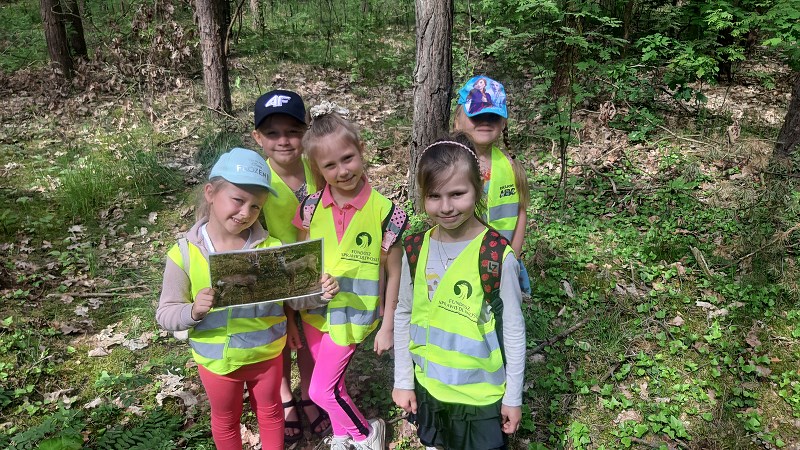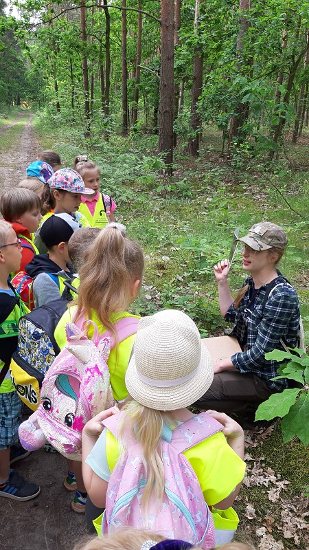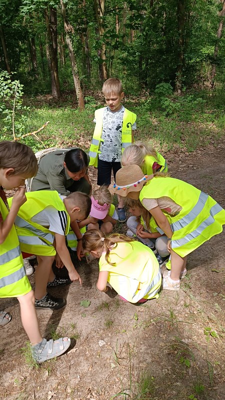 Dzieci zostały podzielone na dwie grupy. Gdy pierwsza grupa zwiedzała Ośrodek wewnątrz - druga grupa wybrała się z Panią przewodnik na zajęcia terenowe do lasu. Głównym celem tych zajęć było odszukanie zwierząt i roślin, o których mówiła pani przewodnik. O ile znalezienie dziupli dzięcioła nie było trudne, to znalezienie domku żuka biegacza, wcale łatwe nie było. Ale nazwy naszych grup zerowych: Odkrywcy, Tropiciele i Podróżnicy zobowiązują do radzenia sobie z zadaniami trudnymi. Oczywiście wszyscy znakomicie poradzili sobie z zagadkami i zadaniami, jakie przygotowały dla dzieci panie przewodniczki.