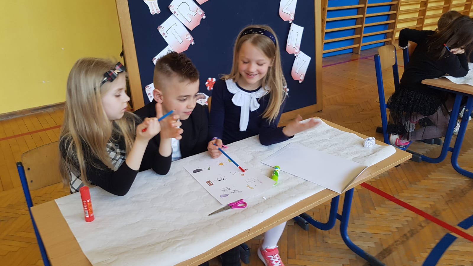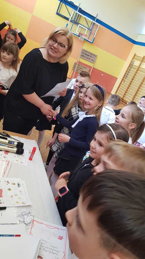 Konkurs patriotyczny "Polska - moja Ojczyzna " organizowany w ramach lekcji otwartej prowadzonej przez Panią Annę Romańczuk –Zawadzką na pewno zapisał się w pamięci uczniów klas pierwszych. Z każdej klasy w drodze eliminacji wyłoniono trzech reprezentantów. To oni byli odpowiedzialni za wykonywanie pięciu zadań. Zadania były nie lada wyzwaniem. Sprawdzały wiedzę o najbardziej znanych zabytkach kraju, znalazły się też zadania z zakresu programowania oraz patriotyczne sudoku. Obie klasy dzielnie rywalizowały. Kibice zostali zaangażowani do zabawy poprzez doping i wymyślanie haseł zagrzewających do walki. Później wspólnymi siłami kolorowali wielką mapę Polski, która była podsumowaniem najważniejszych informacji o kraju . Werdykt był jednoznaczny - klasa 1a i 1b zwyciężyły jednogłośnie, zdobywając tę samą ilość punktów. Fantastyczne nagrody wręczone przez Panią Wicedyrektor Krystynę Trzeciak zostały ufundowane przez Radę Rodziców. Serdecznie dziękujemy.