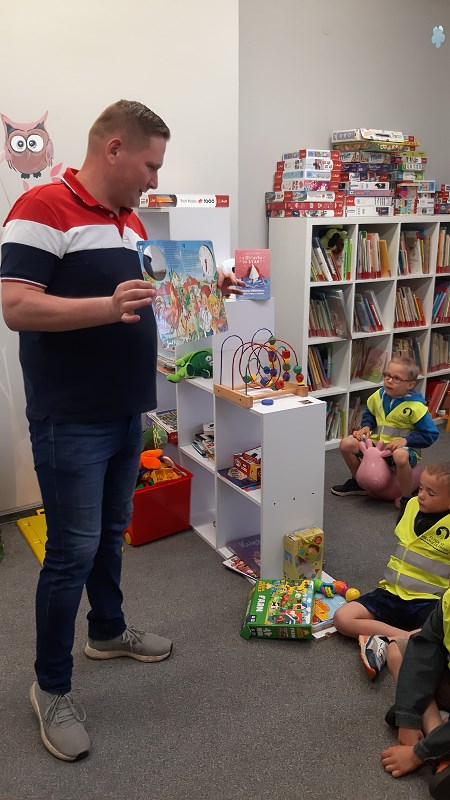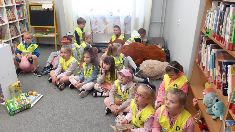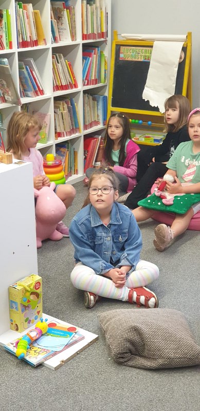 Na początek dzieci oglądały dział biblioteki przeznaczony dla osób dorosłych, a następnie przeszły na piętro do biblioteki przeznaczonej dla młodszych czytelników. Tutaj dzieci dowiedziały się, co należy zrobić, aby stać się czytelnikiem biblioteki oraz jak należy się w niej zachować. Okazało się, że niektóre dzieci przychodzą do biblioteki z rodzicami i starszym rodzeństwem, wypożyczają książeczki i doskonale znają zasady korzystania z biblioteki.