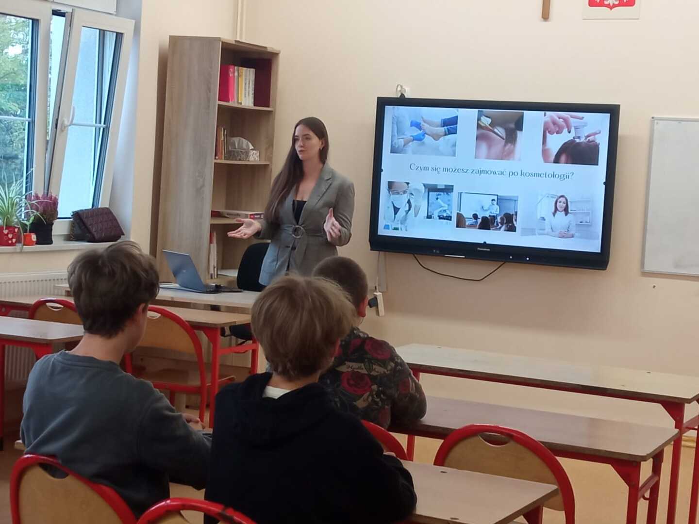 Jaka jest różnica pomiędzy kosmetyczką a kosmetologiem? Te zagadnienia przybliżyła uczniom klasy VIII p. Joanna Włodarczyk- kosmetolog kliniczny w ramach cyklu spotkanie z zawodem. Uczniowie dowiedzieli się również o chorobach skóry oraz o możliwościach jej pielęgnacji i leczenia. Dziękujemy za ciekawą prezentację i poświęcony czas.