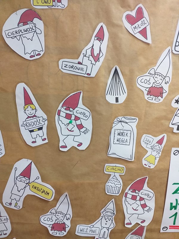 Tuż przed przerwą świąteczno-noworoczną panie z zespołu do spraw pomocy psychologiczno-pedagogicznej przygotowały na parterze nietypowy, ale wyjątkowy „worek z prezentami”, chcąc, by każdy w szkole: młodszy i starszy mógł zabrać ze sobą na święta, to czego szczególnie potrzebuje. Można było wybierać i przebierać w „symbolicznych” upominkach. Były konkrety, np. worek węgla, ale i te mniej oczywiste: miłość, spokój, czas na sen, uśmiech. Małe karteczki, ale z wielkim przesłaniem i życzeniami, by w Boże Narodzenie się spełniło, to, o czym marzymy. Jednak święta to nie stół i ozdoby, a ludzie z ich uśmiechami i ciepłymi spojrzeniami. Jeden z bohaterów w „Opowieści wigilijnej” Charlesa Dickensa powiedział: „Jest mnóstwo rzeczy, które przyniosły mi wiele dobrego choć nie przyniosły mi żadnego zysku. Taką rzeczą są właśnie święta Bożego Narodzenia. Oczywiście, jest to czas hołdu i czci dla samego wydarzenia, ale dla mnie te święta to także miły czas dobroci, wybaczania i miłosierdzia.” Prezenciki szybko zaczęły znikać, a to znaczy, że były potrzebne. Mamy nadzieję, że w Boże Narodzenie się urzeczywistniły. Radosnego świętowania!