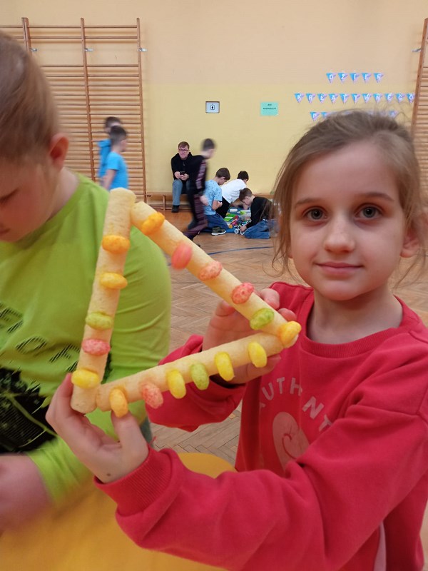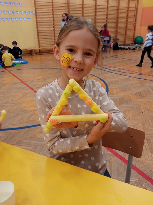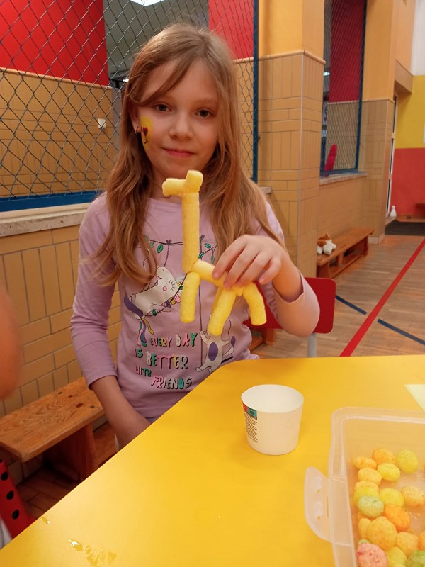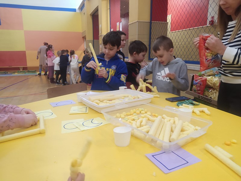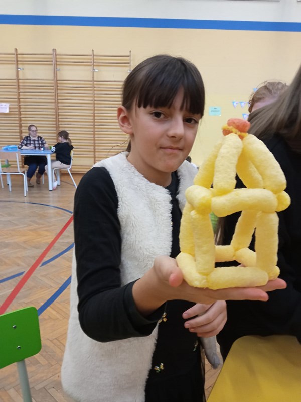 Stanowisko 1 – „Chrupiące kształty”, na którym wraz z panią Anną Klimas – Guzendą dzieci budowały niesamowite konstrukcje z chrupek kukurydzianych.