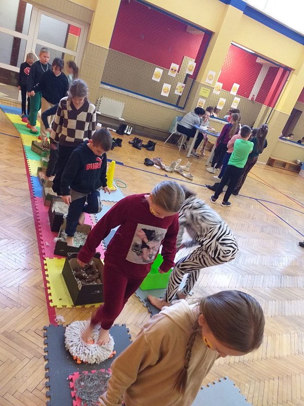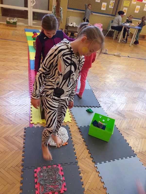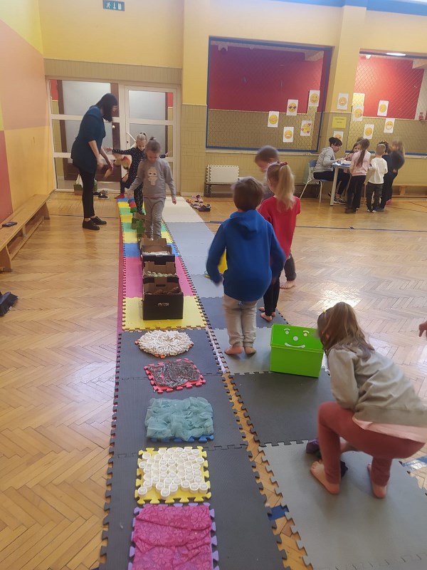 Stanowisko 3 – „Z uśmiechem przez świat”, gdzie dzieci razem z panią Dominiką Nenycz wędrowały przez ścieżkę sensoryczną, poznając dotykiem różnorodną strukturę elementów przygotowanego toru przeszkód.