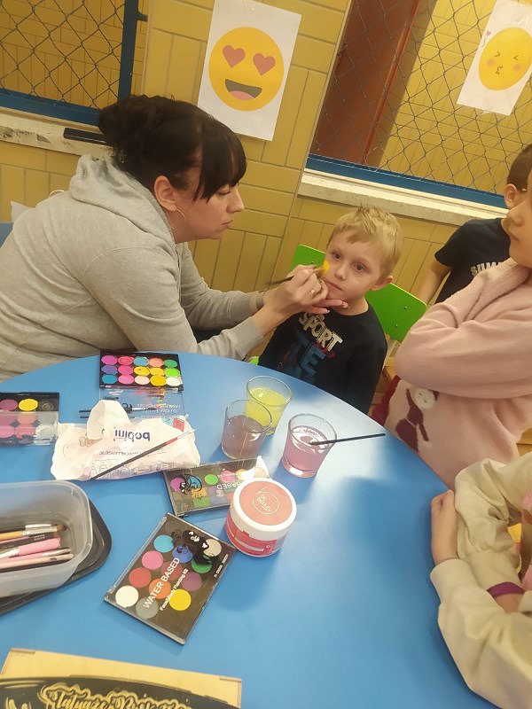 Stanowisko 2 – „Pozytywne emotki”, gdzie pani Anna Molsa malowała przeróżne, optymistyczne emotki na twarzach najmłodszych uczestników.