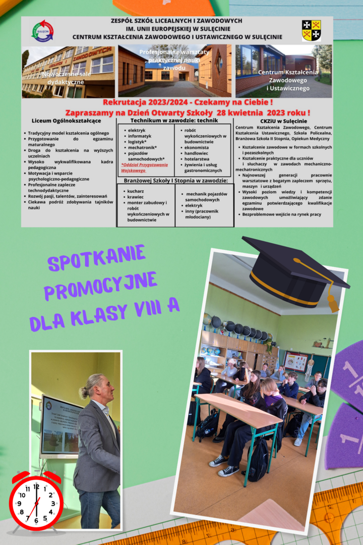 Z kolei p. Krzysztof Jacniacki przedstawił nową ofertę edukacyjną ZSLiZ w Sulęcinie na rok szkolny 2024/2025. Uczniowie zapoznali się z charakterystyką poszczególnych zawodów, systemem rekrutacji. Obejrzeli zdjęcia nowoczesnych warsztatów do kształcenia zawodowego, gabinetów, obiektów szkolnych, które będą mogli zobaczyć na żywo podczas Dnia Otwartego. P. Krzysztof Jacniacki opowiedział o sukcesach absolwentów, co dodatkowo zmotywowało uczniów do planowania swojej przyszłości edukacyjnej.