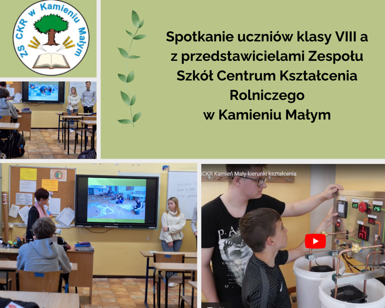 W minionym tygodniu nasi ósmoklasiści mieli okazję odkryć świat edukacji dla uczniów szkół ponadpodstawowych podczas spotkania z przedstawicielami Zespołu Szkół Centrum Kształcenia Rolniczego w Kamieniu Małym oraz wicedyrektorem Zespołu Szkół Licealnych i Zawodowych im. Unii Europejskiej p. Krzysztofem Jacniackim.