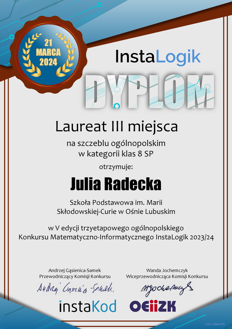Antonina Wilk oraz Julia Radecka zostały laureatkami ogólnopolskiego Konkursu Matematyczno – Informatycznego InstaLogik w kategorii uczniów klas VIII.