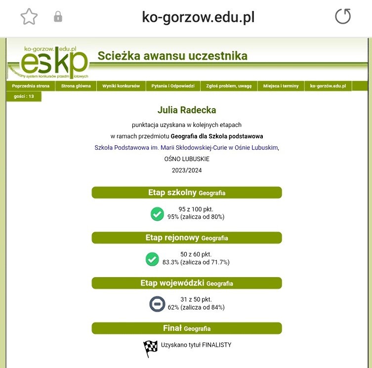 Julia, uczennica klasy ósmej, została finalistką Konkursu Przedmiotowego z Języka Polskiego oraz Konkursu Przedmiotowego z Geografii.