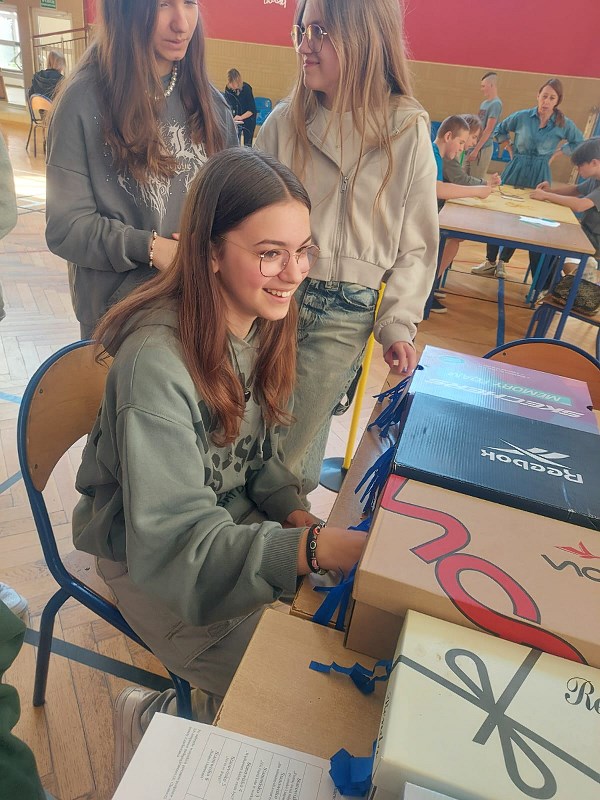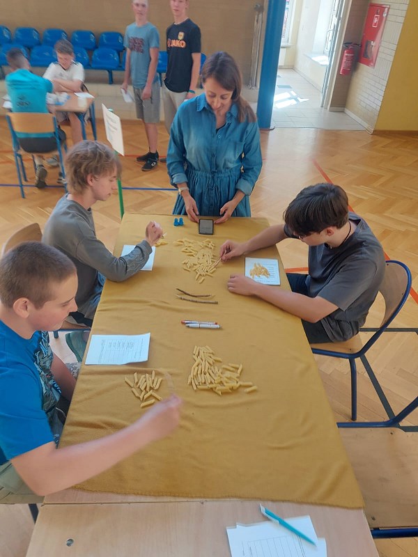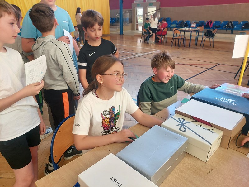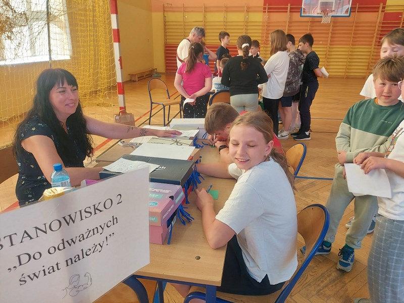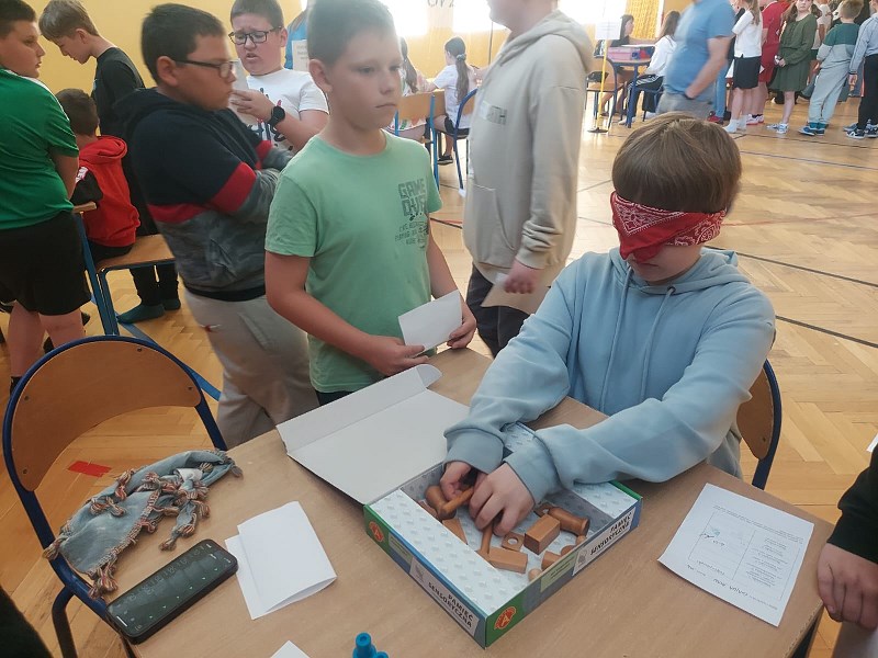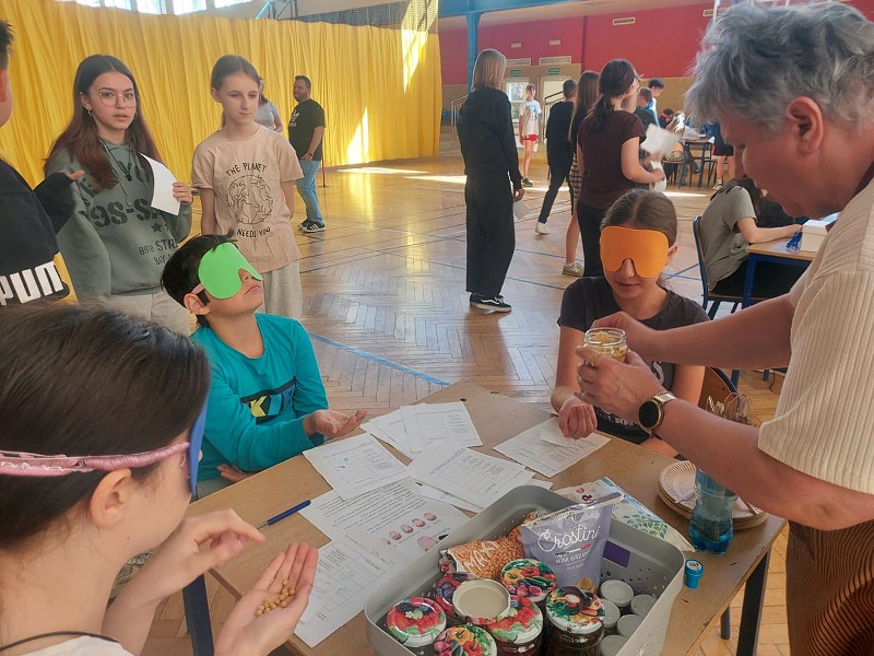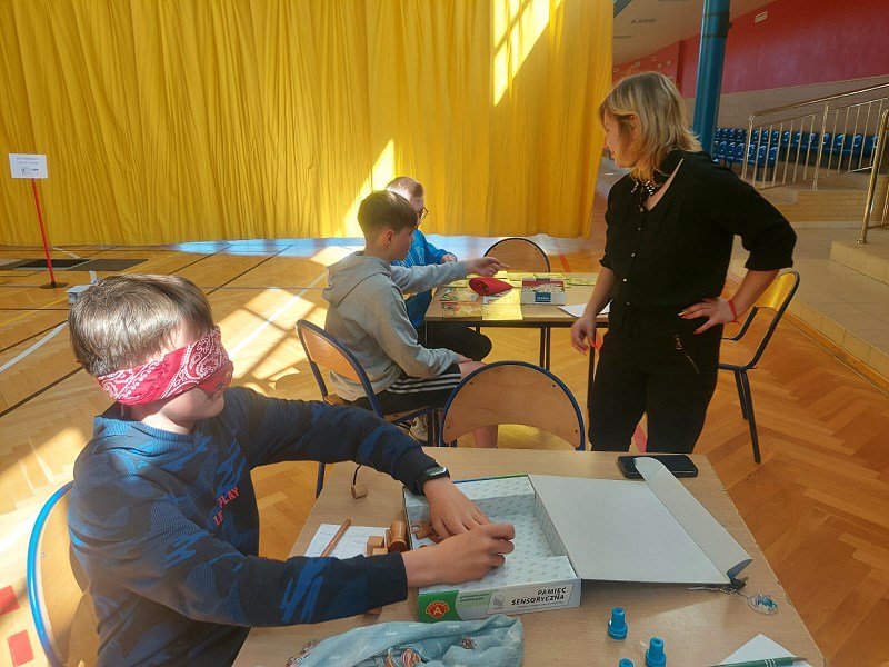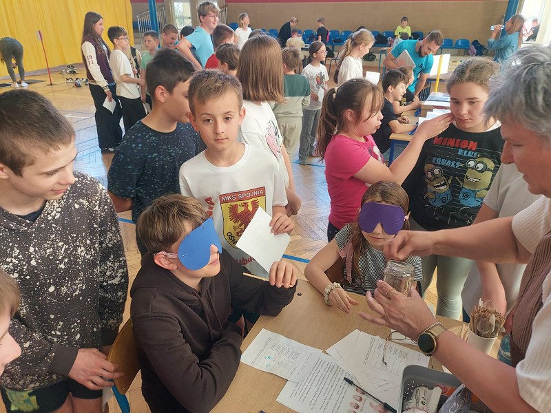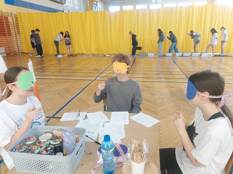 Nauczyciele z zespołu pomocy psychologiczno – pedagogicznej przygotowali 13 maja 2024r. dla uczniów klasa IV – VIII oraz nauczycieli Dzień Zmysłów. Na sali gimnastycznej każdy mógł zobaczyć, jak ważne znaczenie mają zmysły smaku, węchu, słuchu, wzroku i dotyku. Na pierwszym stanowisku „Poznaj świat mój brachu po smaku i zapachu!” pani Beata Pilimon prowadziła ćwiczenia dotyczące smaku i zapachu różnych potraw. Dzieci, z zasłoniętymi oczami, kosztowały, wąchały i odgadywały, jakie smakołyki mają przed sobą. Na kolejnym stanowisku pani Ania Molsa zachęcała młodzież do odkrywania tajemnic ukrytych w różnych pudełkach. Za pomocą dotyku odważni uczniowie odkrywali przygotowane zagadki. Niejednemu zadrżała ręka, gdy badali zawartość pudełek, ale odwaga zwyciężyła i z tym zadaniem każdy sobie poradził. Na stanowisku „Nie kupuj kota w worku” pani Ola Chomicz i pani Wiktoria Rutkowska zapraszały dzieci do gier ćwiczących słuch i pamięć sensoryczną. Okazało się, że wbrew pozorom zadania nie były takie proste i potrzebna była koncentracja i skupienie. Jednak i tutaj każdy z uczestników poradził sobie świetnie. Pani Ania Klimas – Guzenda zapraszała do punktu „Wędkarzem każdy może być!”, na którym uczniowie ćwiczyli sprawność i precyzyjność przenosząc makaron patyczkami na drugą stronę stołu. To zadanie sprawiło dużo radości