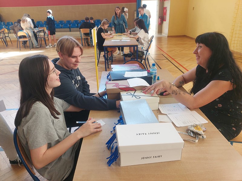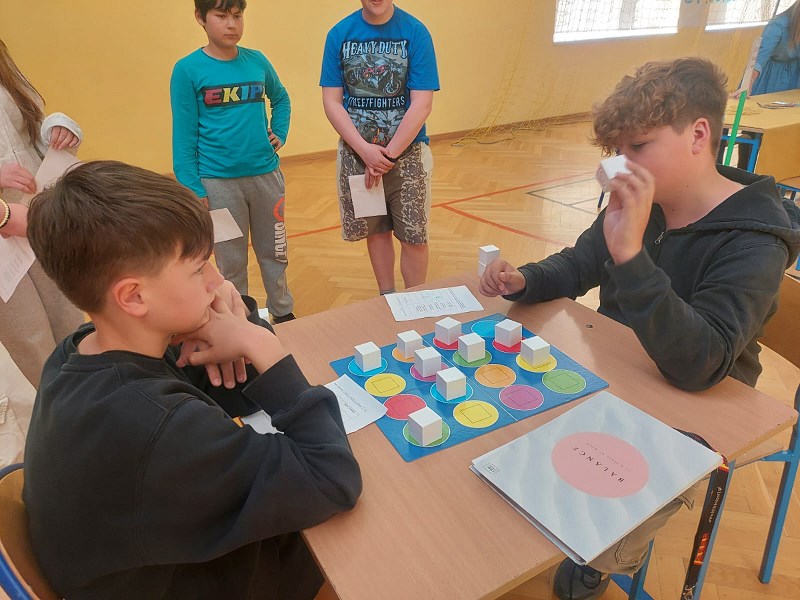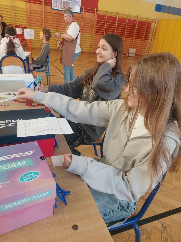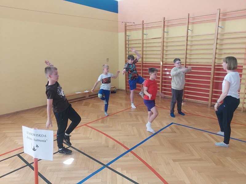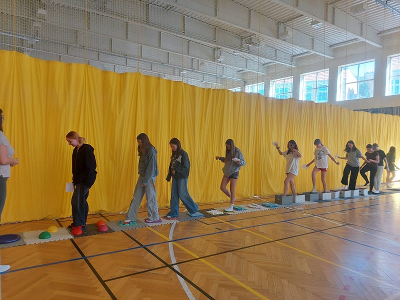 i poprawiło humor wielu osobom. Następnym etapem było stanowisko pani Dominiki Nenycz „No to w drogę”. Świetnia przygotowana ścieżka sensoryczna dała możliwość zmierzenia się z różnymi, nietypowymi przeszkodami. Młodzież powtarzała drogę kilkukrotnie w skarpetkach, a nawet na boso. Ostatnim przystankiem Dnia Zmysłów było stanowisko „Balans i harmonia” pani Ani Stefaniak. Tutaj uczniowie i nauczyciele wyciszali się, trenowali koncentrację i równowagę, wykorzystując elementy ćwiczeń z jogi.