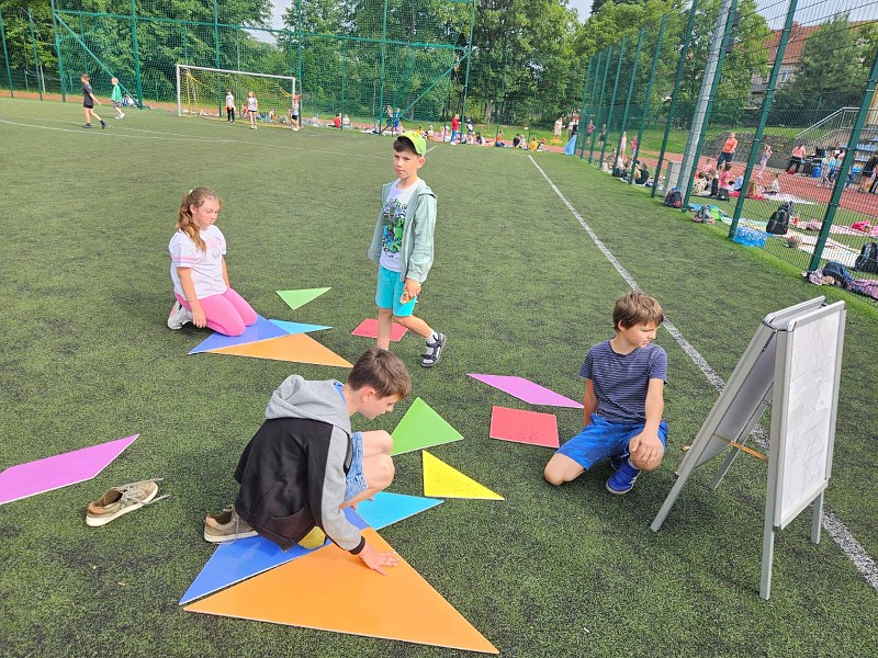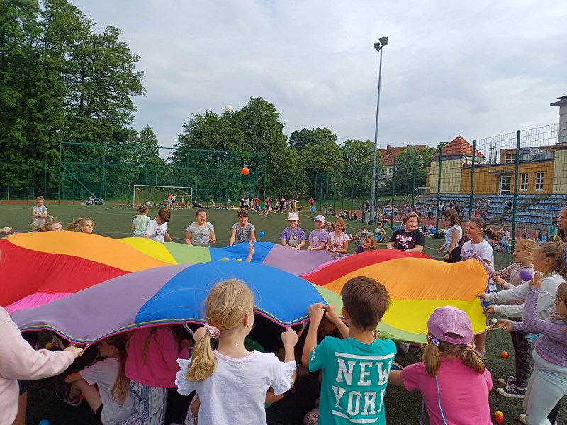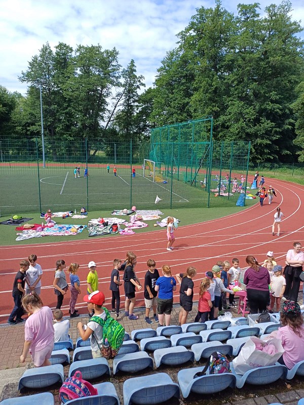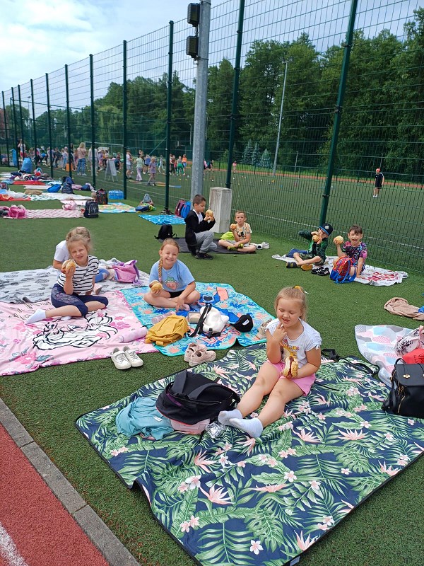 Na boisku szkolnym dzieci rozłożyły koce oraz przekąski przyniesione z domu. W tym dniu na uczniów czekały nie lada atrakcje. Nasi podopieczni uczestniczyli w zabawach muzyczno-ruchowych prowadzonych przez animatora z wykorzystaniem między innymi piłeczek, chusty animacyjnej oraz baniek mydlanych. Piknik obfitował również w moc konkurencji sportowych, sprzyjających zdrowej rywalizacji. W czasie zabawy można było również zjeść pyszną kiełbaskę z grilla przygotowaną przez rodziców. Największą niespodzianką dla naszych milusińskich okazała się najsłodsza na świecie wata cukrowa, która dopełniła smakiem ten cudowny i pełen wrażeń dzień.