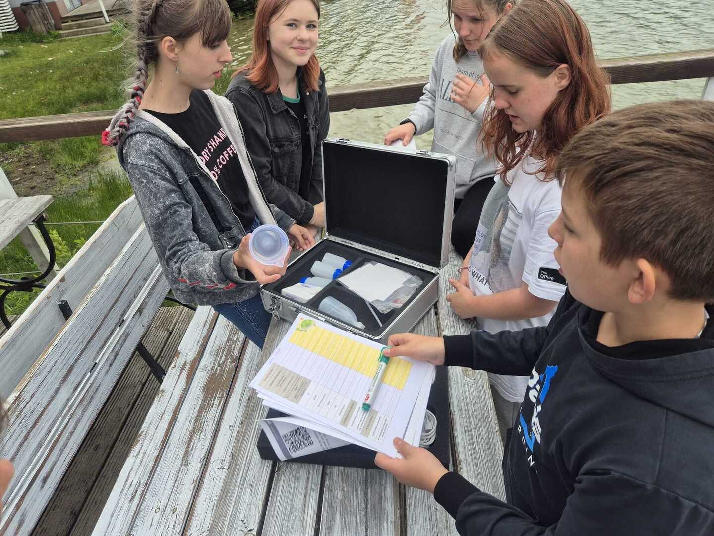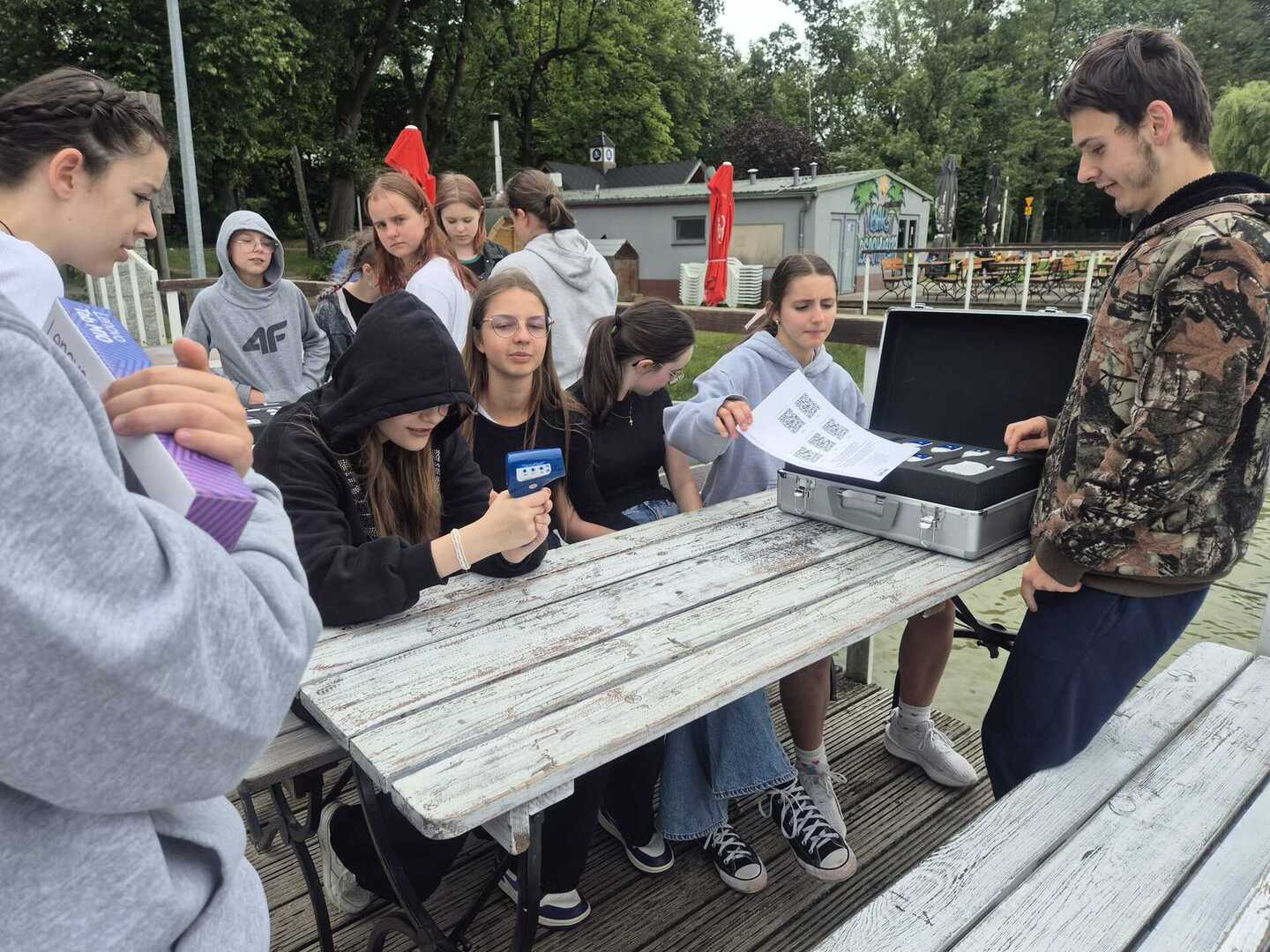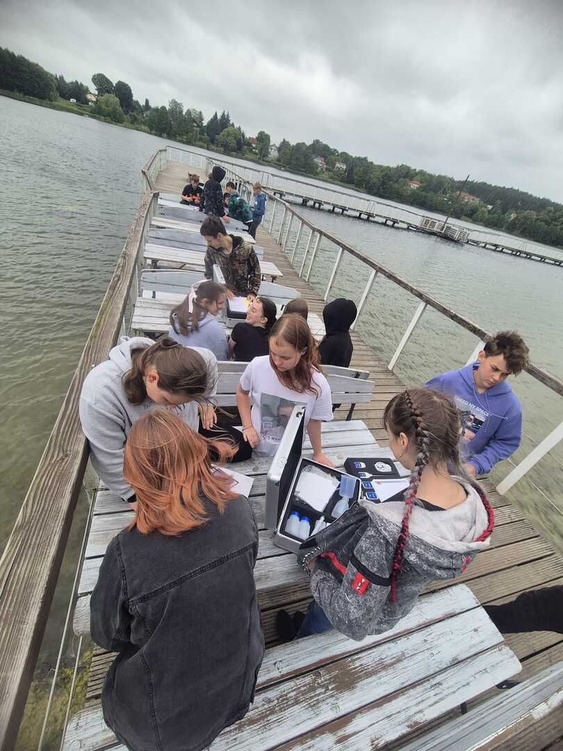 W czasie lekcji chemii klasa VII A miała okazje wykonywać doświadczenia dotyczące wody przy pomocy sprzętu zakupionego z projektu Lubuskie Szkoły Eksperymentów. Uczniowie badali wodę nad jeziorem Reczynek. Sprawdzali jej temperaturę, przejrzystość oraz zapach.