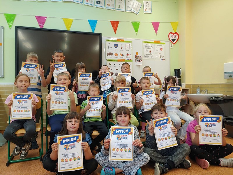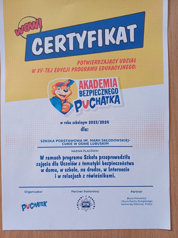 Z wielką przyjemnością informujemy, że każdy uczeń klasy pierwszej wykazał się wielką wiedzą na temat omówionych zagadnień i otrzymał Dyplom Akademii Bezpiecznego Puchatka, a nasza szkoła otrzymała Certyfikat potwierdzający udział w XV-tej edycji programu.