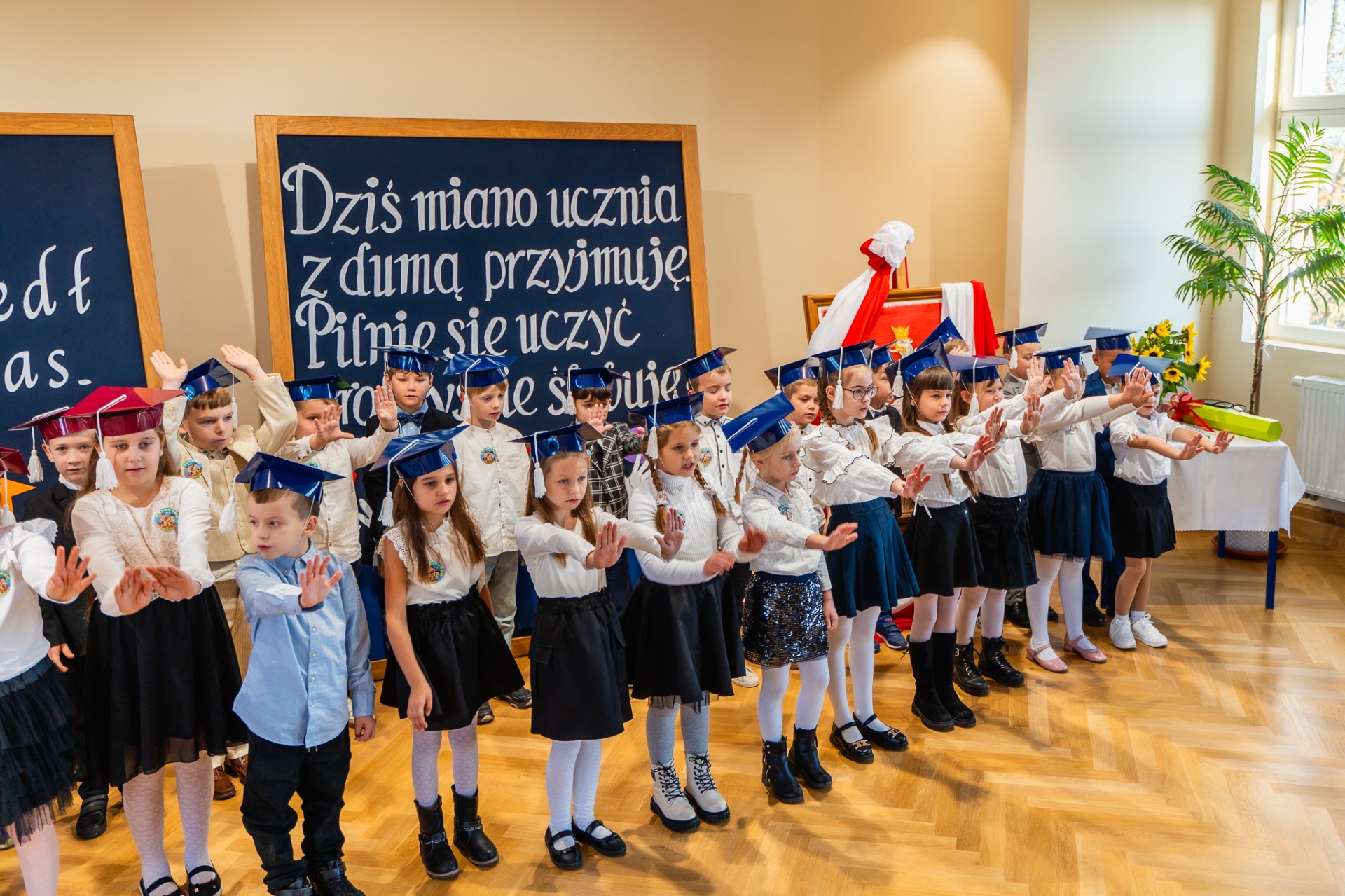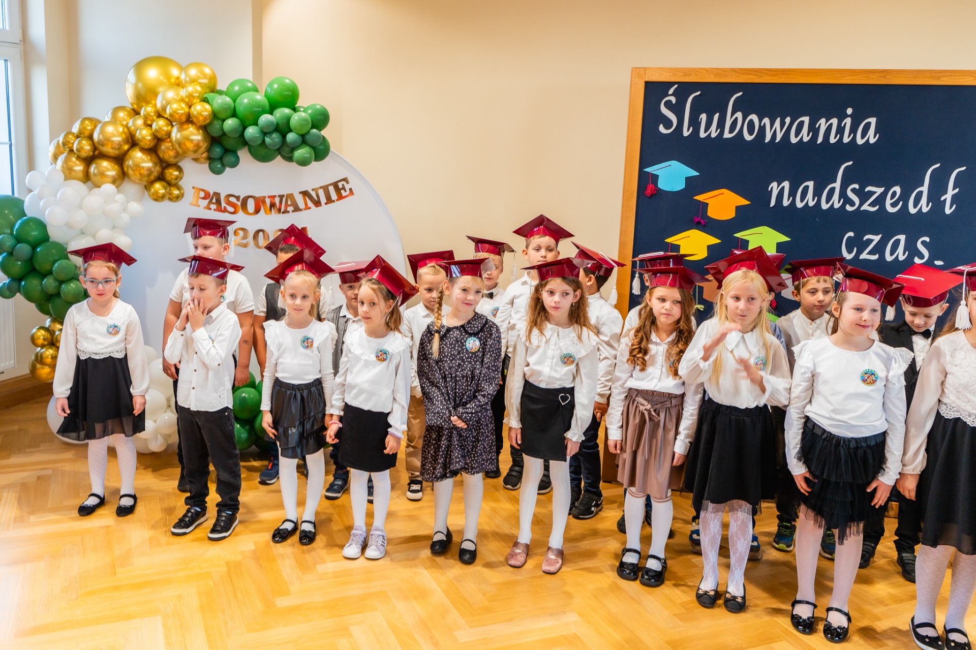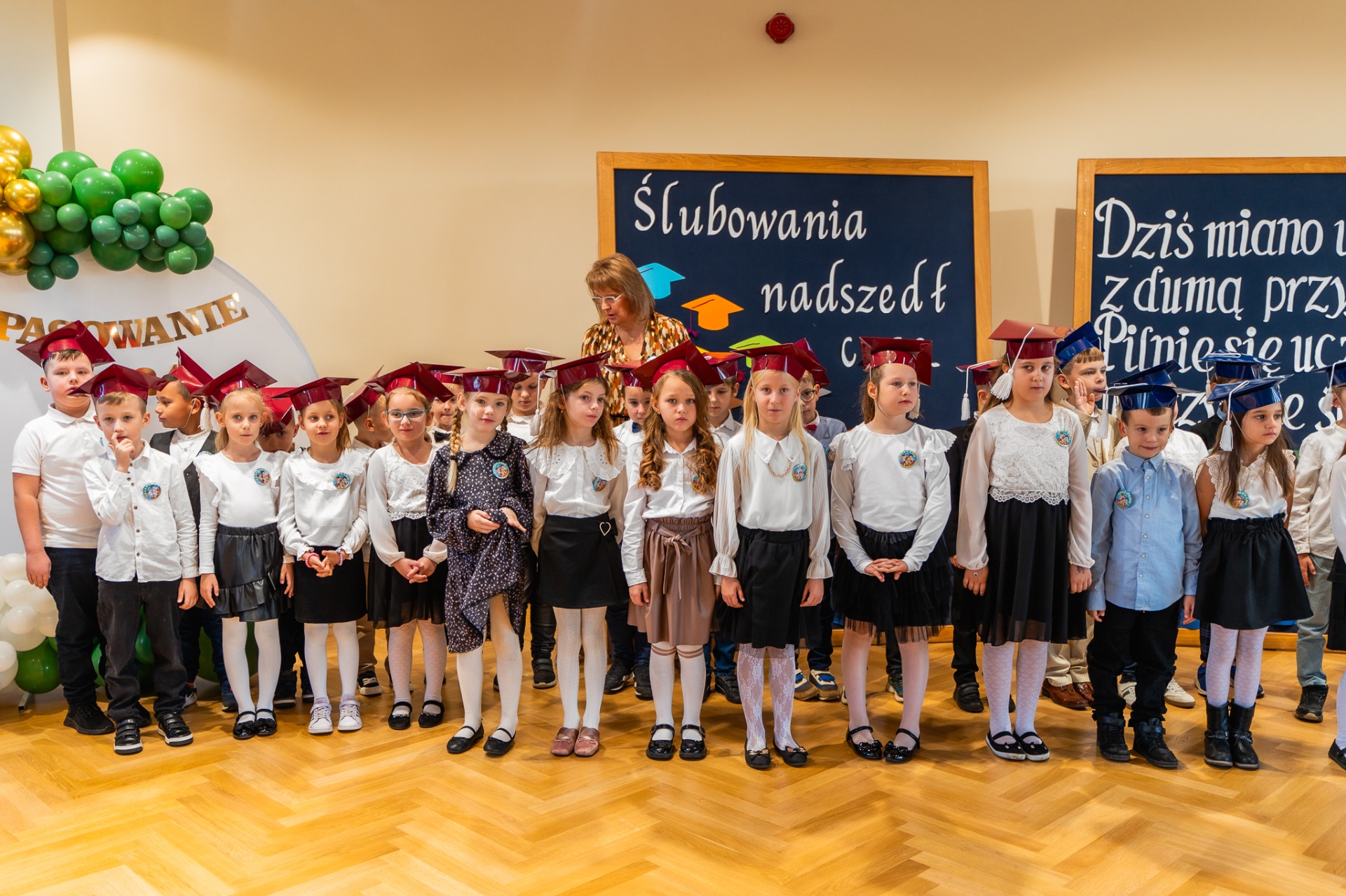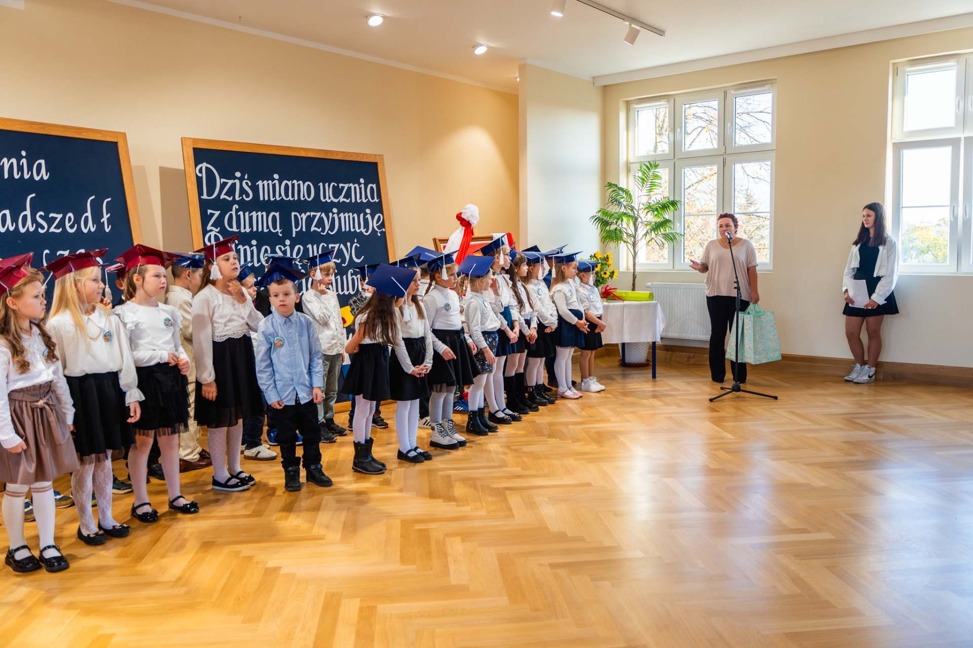 Mimo stresu związanego z publicznym występem, świetnie sobie poradzili w czasie uroczystości. W rytmie poloneza wkroczyli na salę. Bezbłędnie wyrecytowali wiersze i zaśpiewali piosenki. Wykazali się wiedzą i zręcznością oraz znajomością symboli narodowych, które z dumą prezentowali . Swoją postawą udowodnili, iż są gotowi do złożenia uroczystego ślubowania. Obiecali być pilnymi i wzorowymi uczniami, dobrymi kolegami, prawymi Polakami i godnie reprezentować dobre imię naszej szkoły. Swym zachowaniem i nauką sprawiać radość rodzicom i nauczycielom. Po złożeniu przyrzeczenia, pan dyrektor Kamilla Kwiręg dokonała aktu pasowania, który symbolizuje oficjalne przyjęcie w poczet uczniów Szkoły Podstawowej im. Marii Skłodowskiej-Curie w Ośnie Lubuskim. Każdy pierwszoklasista otrzymał pamiątkowy dyplom i upominki od zaproszonych gości. Ten miły i pełen niezapomnianych wrażeń dzień zakończył się słodkim poczęstunkiem przygotowanym przez rodziców i z pewnością pozostanie w pamięci dzieci na długo.