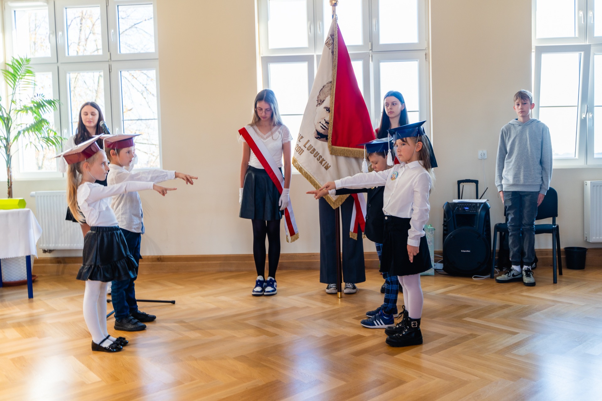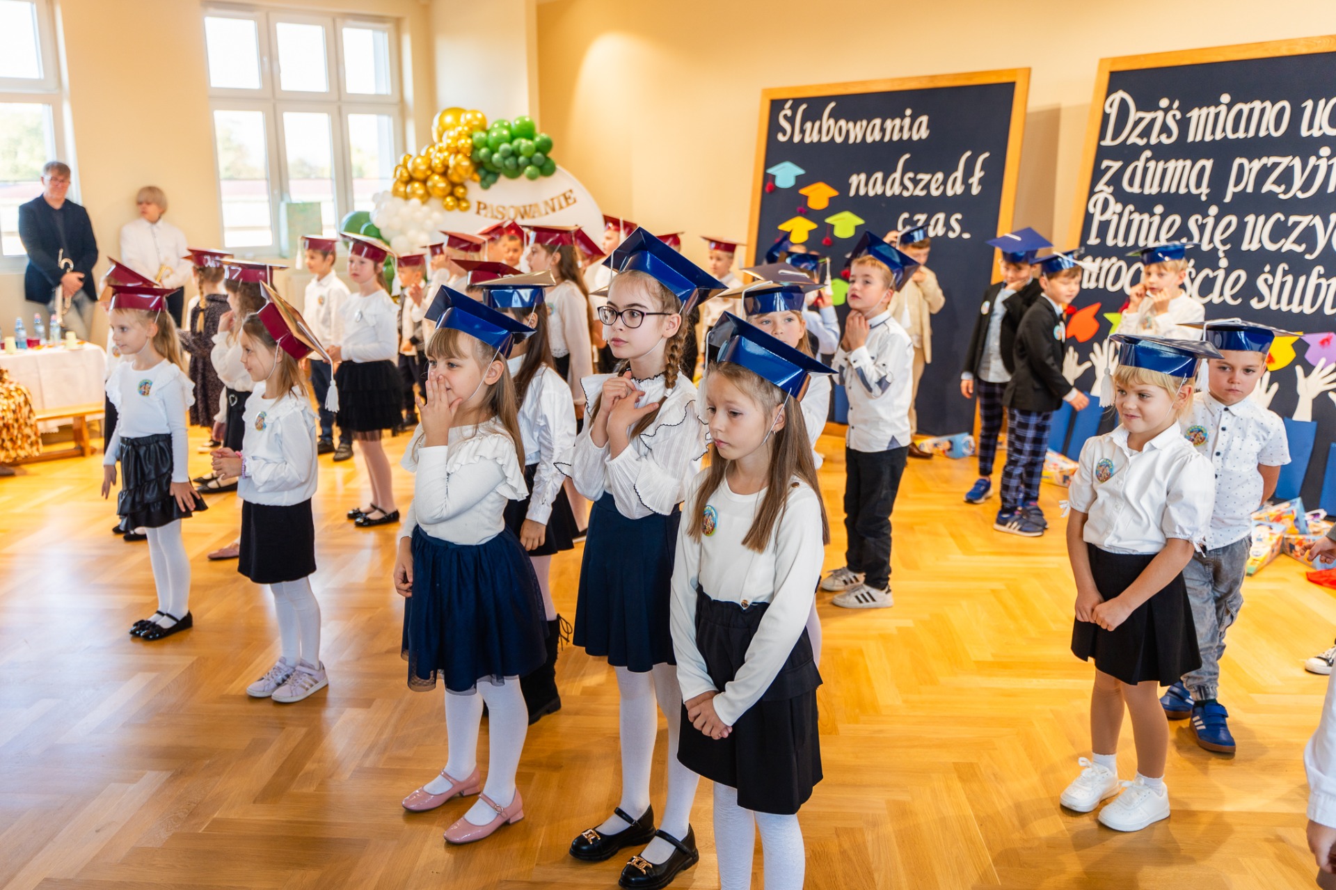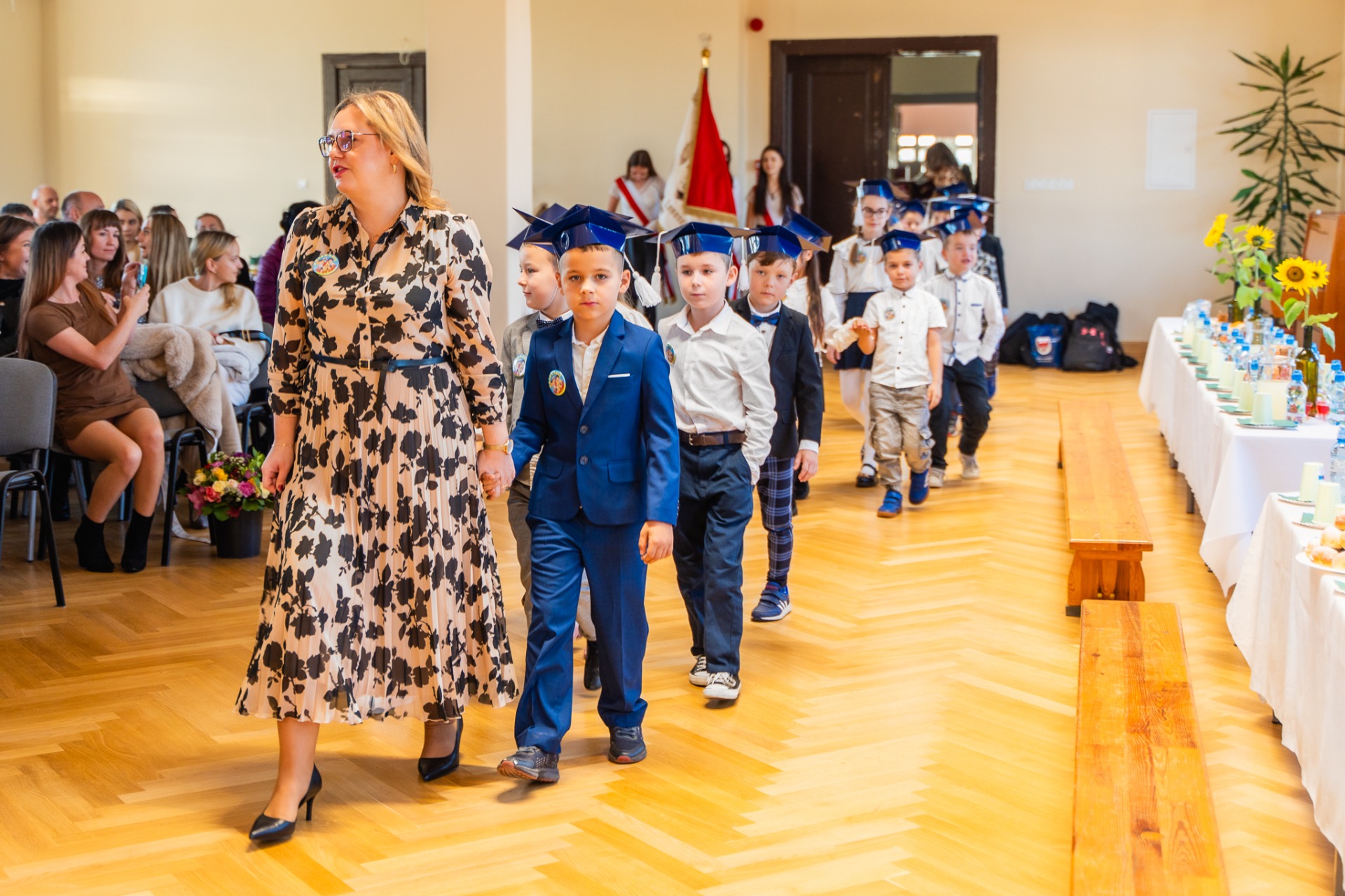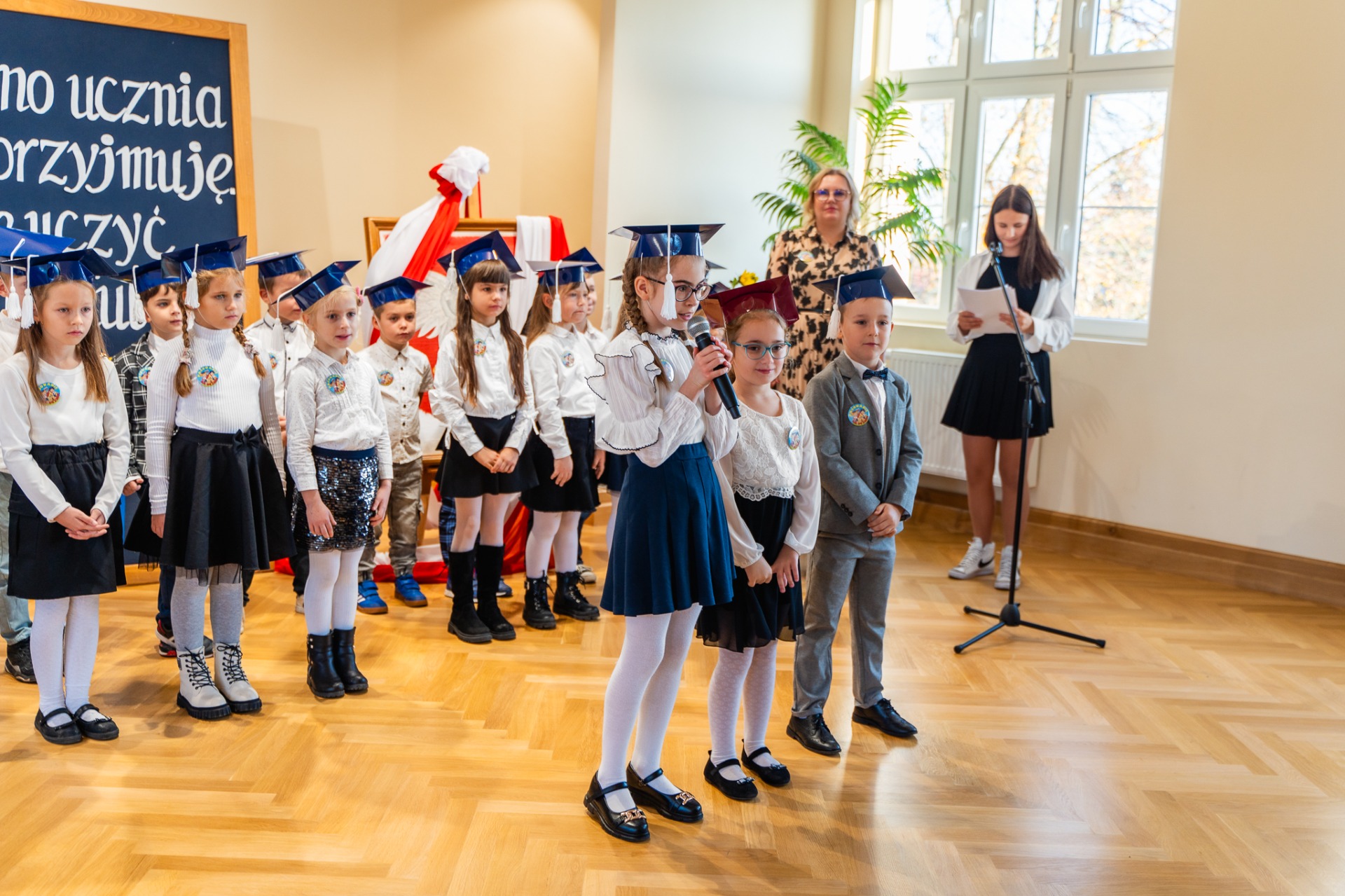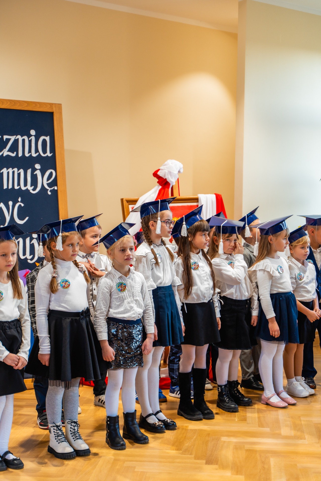 Mimo stresu związanego z publicznym występem, świetnie sobie poradzili w czasie uroczystości. W rytmie poloneza wkroczyli na salę. Bezbłędnie wyrecytowali wiersze i zaśpiewali piosenki. Wykazali się wiedzą i zręcznością oraz znajomością symboli narodowych, które z dumą prezentowali . Swoją postawą udowodnili, iż są gotowi do złożenia uroczystego ślubowania. Obiecali być pilnymi i wzorowymi uczniami, dobrymi kolegami, prawymi Polakami i godnie reprezentować dobre imię naszej szkoły. Swym zachowaniem i nauką sprawiać radość rodzicom i nauczycielom. Po złożeniu przyrzeczenia, pan dyrektor Kamilla Kwiręg dokonała aktu pasowania, który symbolizuje oficjalne przyjęcie w poczet uczniów Szkoły Podstawowej im. Marii Skłodowskiej-Curie w Ośnie Lubuskim. Każdy pierwszoklasista otrzymał pamiątkowy dyplom i upominki od zaproszonych gości. Ten miły i pełen niezapomnianych wrażeń dzień zakończył się słodkim poczęstunkiem przygotowanym przez rodziców i z pewnością pozostanie w pamięci dzieci na długo.