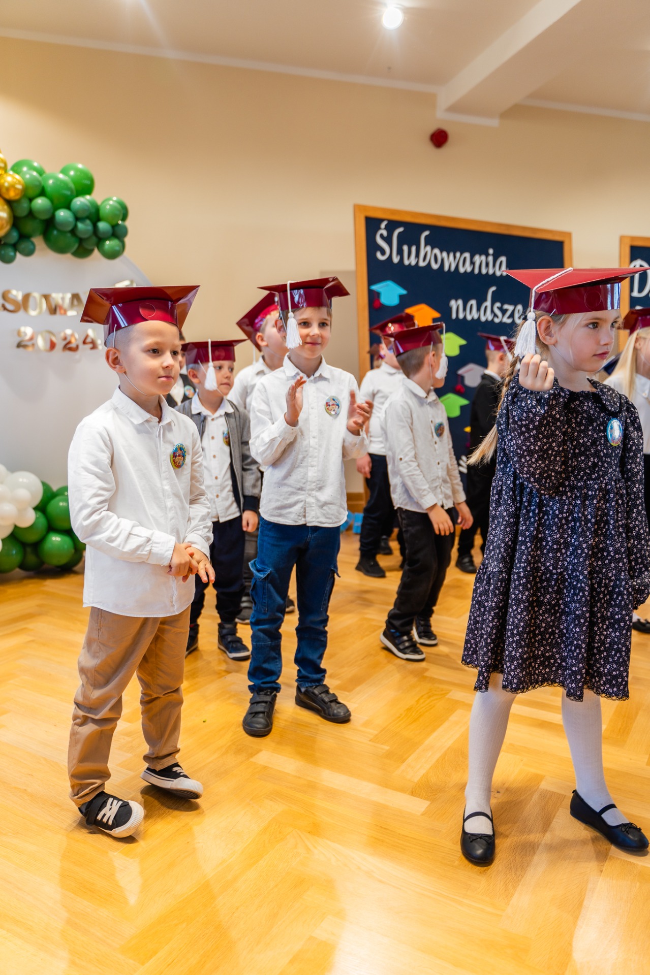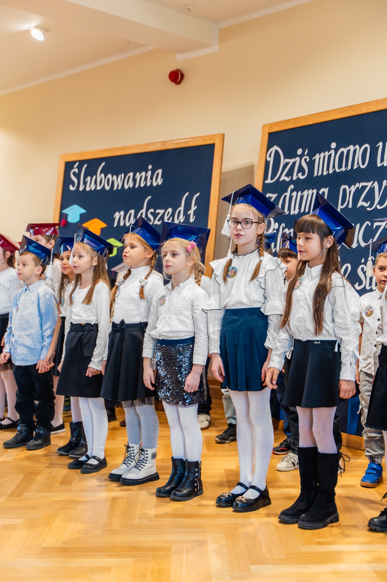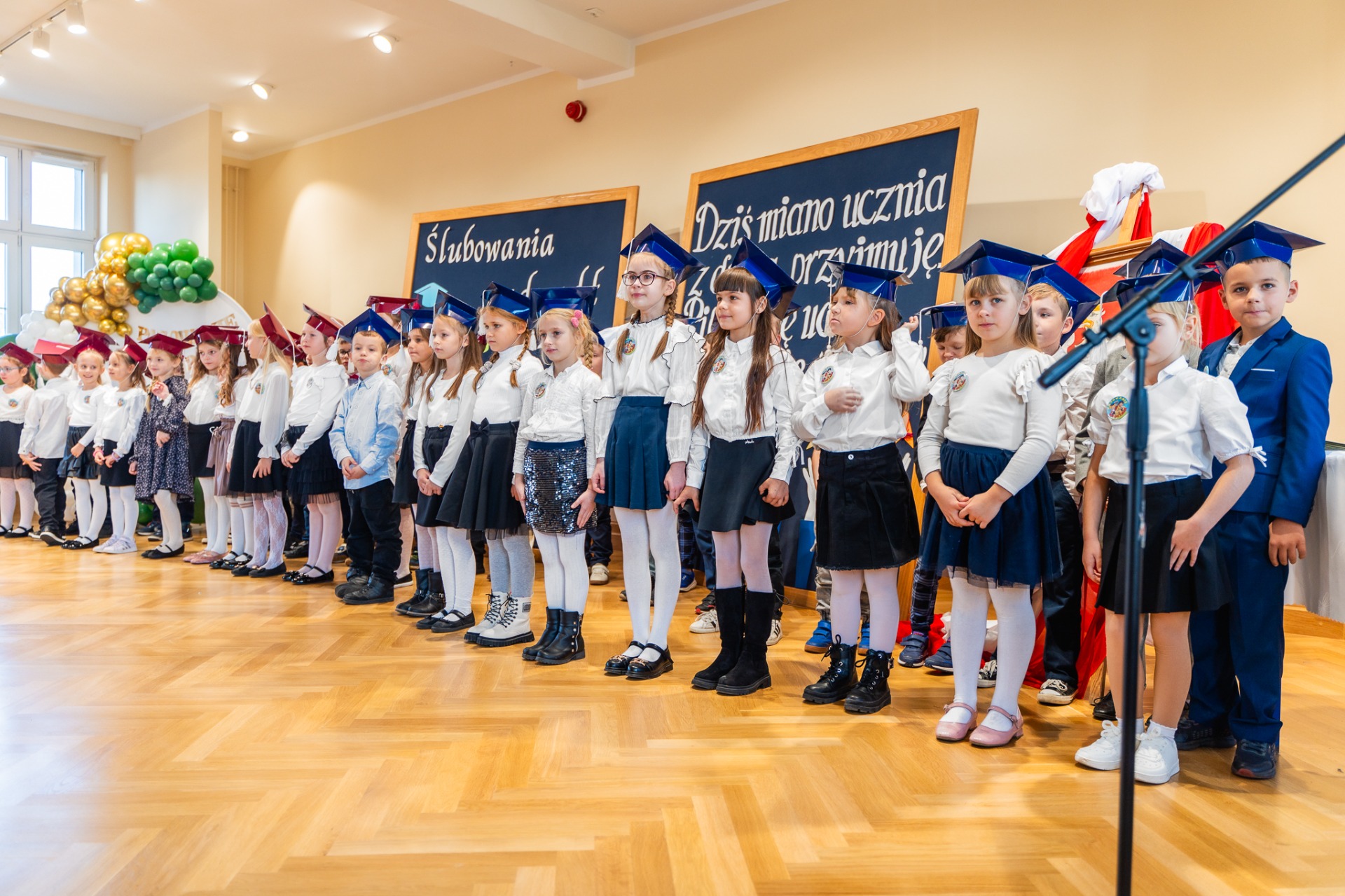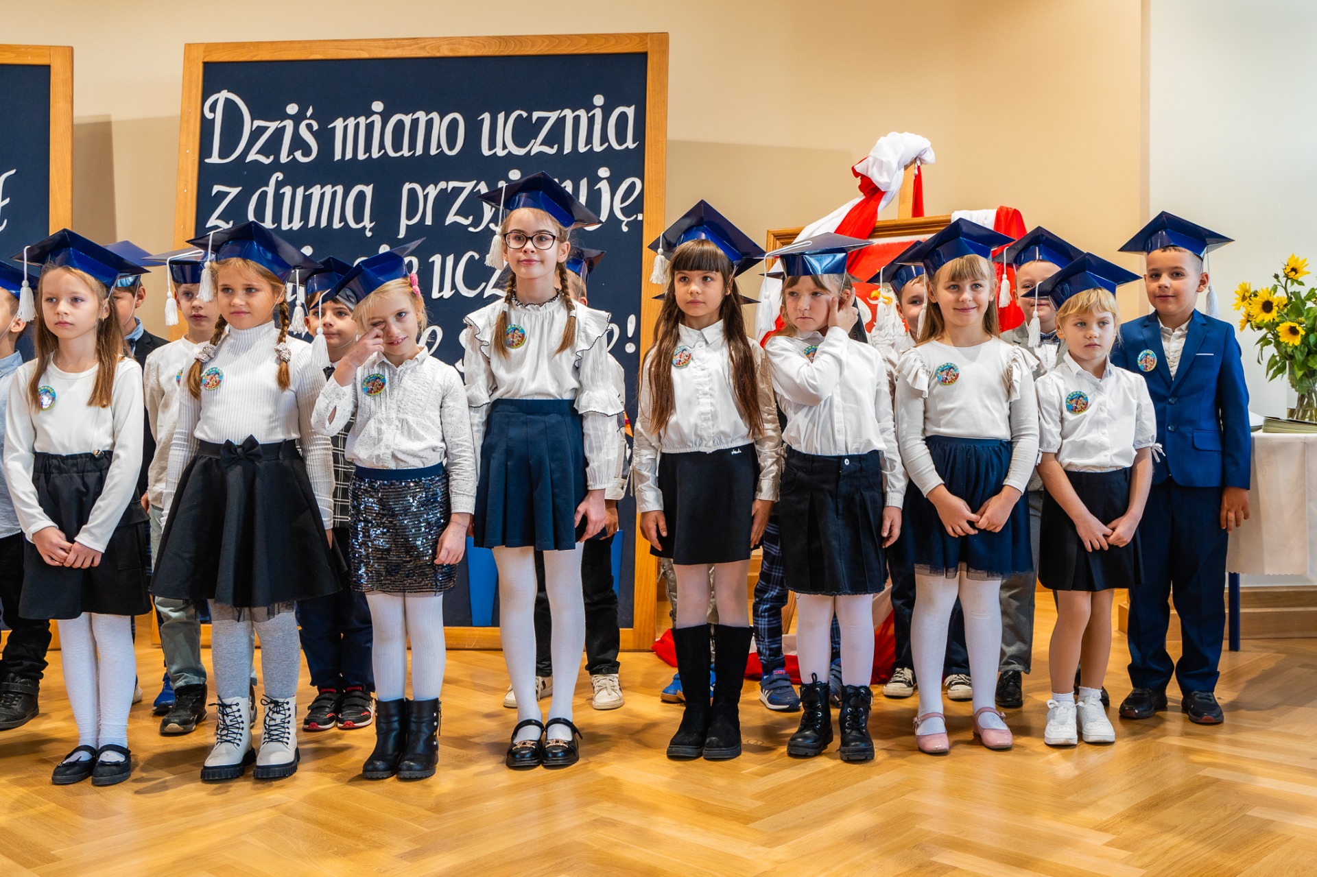 Mimo stresu związanego z publicznym występem, świetnie sobie poradzili w czasie uroczystości. W rytmie poloneza wkroczyli na salę. Bezbłędnie wyrecytowali wiersze i zaśpiewali piosenki. Wykazali się wiedzą i zręcznością oraz znajomością symboli narodowych, które z dumą prezentowali . Swoją postawą udowodnili, iż są gotowi do złożenia uroczystego ślubowania. Obiecali być pilnymi i wzorowymi uczniami, dobrymi kolegami, prawymi Polakami i godnie reprezentować dobre imię naszej szkoły. Swym zachowaniem i nauką sprawiać radość rodzicom i nauczycielom. Po złożeniu przyrzeczenia, pan dyrektor Kamilla Kwiręg dokonała aktu pasowania, który symbolizuje oficjalne przyjęcie w poczet uczniów Szkoły Podstawowej im. Marii Skłodowskiej-Curie w Ośnie Lubuskim. Każdy pierwszoklasista otrzymał pamiątkowy dyplom i upominki od zaproszonych gości. Ten miły i pełen niezapomnianych wrażeń dzień zakończył się słodkim poczęstunkiem przygotowanym przez rodziców i z pewnością pozostanie w pamięci dzieci na długo.