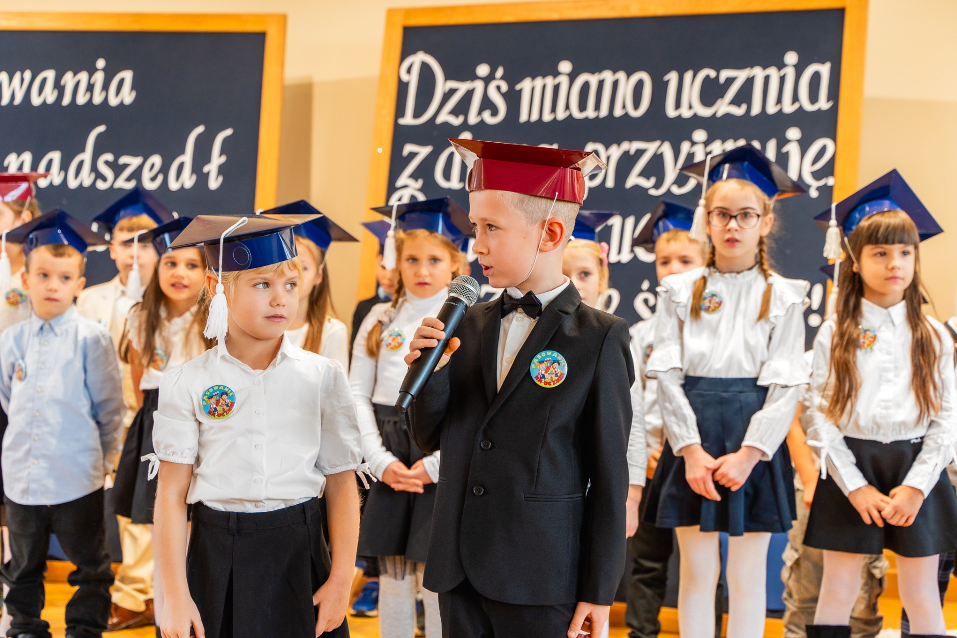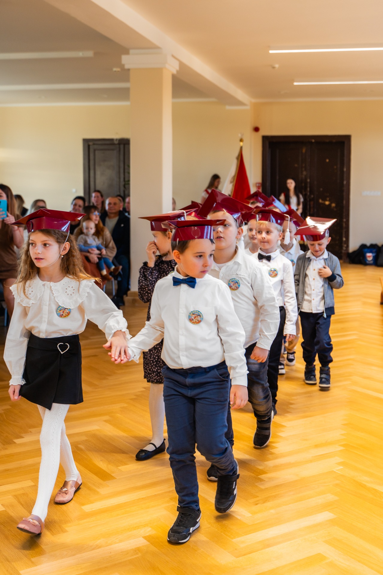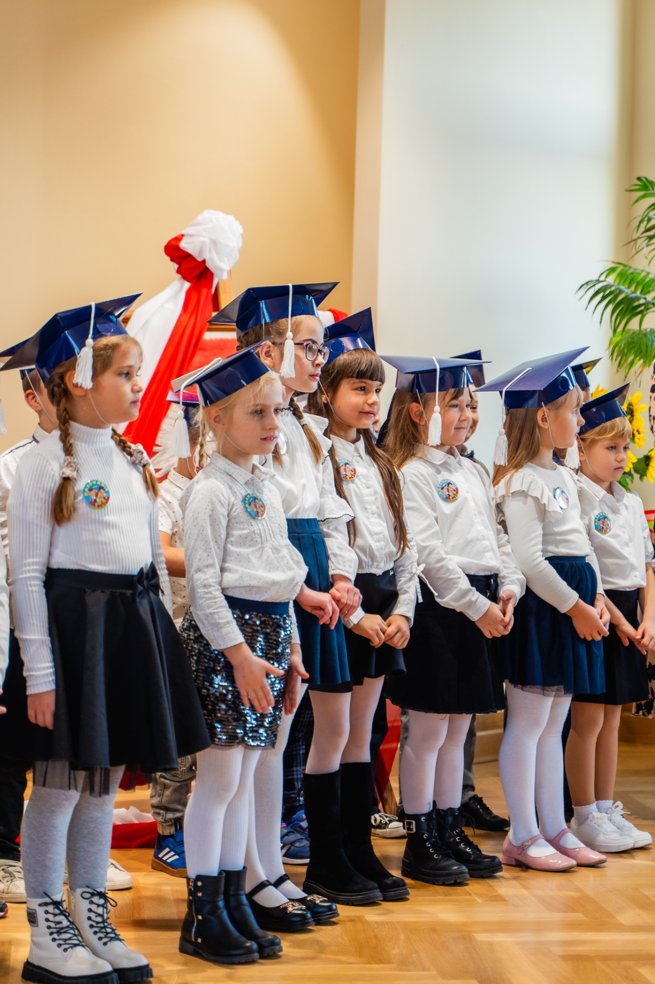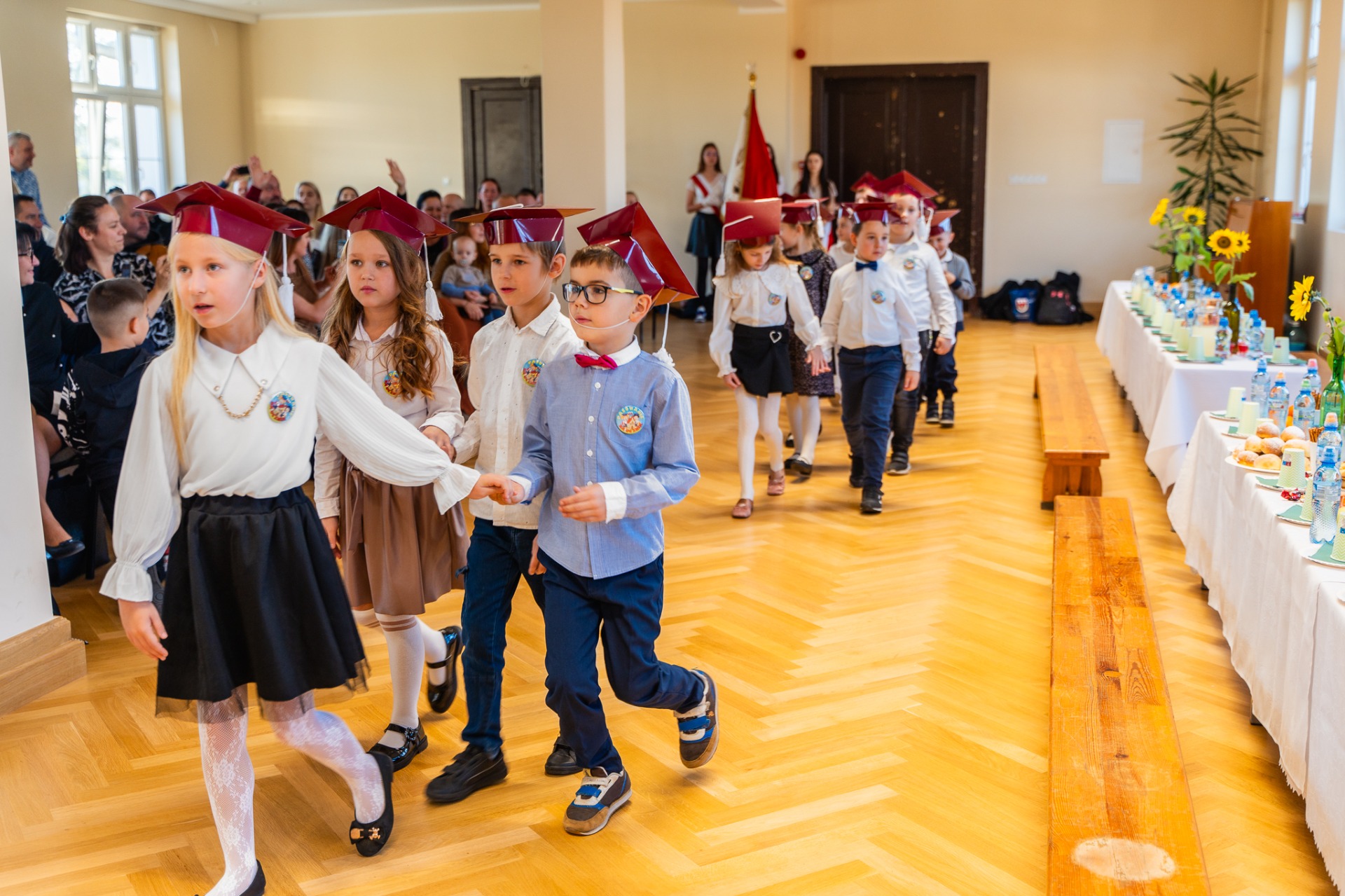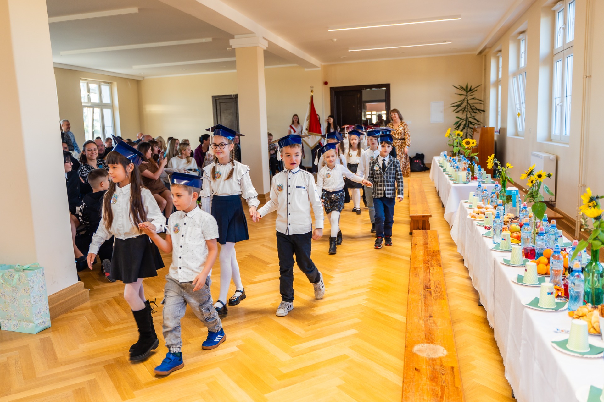 Mimo stresu związanego z publicznym występem, świetnie sobie poradzili w czasie uroczystości. W rytmie poloneza wkroczyli na salę. Bezbłędnie wyrecytowali wiersze i zaśpiewali piosenki. Wykazali się wiedzą i zręcznością oraz znajomością symboli narodowych, które z dumą prezentowali . Swoją postawą udowodnili, iż są gotowi do złożenia uroczystego ślubowania. Obiecali być pilnymi i wzorowymi uczniami, dobrymi kolegami, prawymi Polakami i godnie reprezentować dobre imię naszej szkoły. Swym zachowaniem i nauką sprawiać radość rodzicom i nauczycielom. Po złożeniu przyrzeczenia, pan dyrektor Kamilla Kwiręg dokonała aktu pasowania, który symbolizuje oficjalne przyjęcie w poczet uczniów Szkoły Podstawowej im. Marii Skłodowskiej-Curie w Ośnie Lubuskim. Każdy pierwszoklasista otrzymał pamiątkowy dyplom i upominki od zaproszonych gości. Ten miły i pełen niezapomnianych wrażeń dzień zakończył się słodkim poczęstunkiem przygotowanym przez rodziców i z pewnością pozostanie w pamięci dzieci na długo.