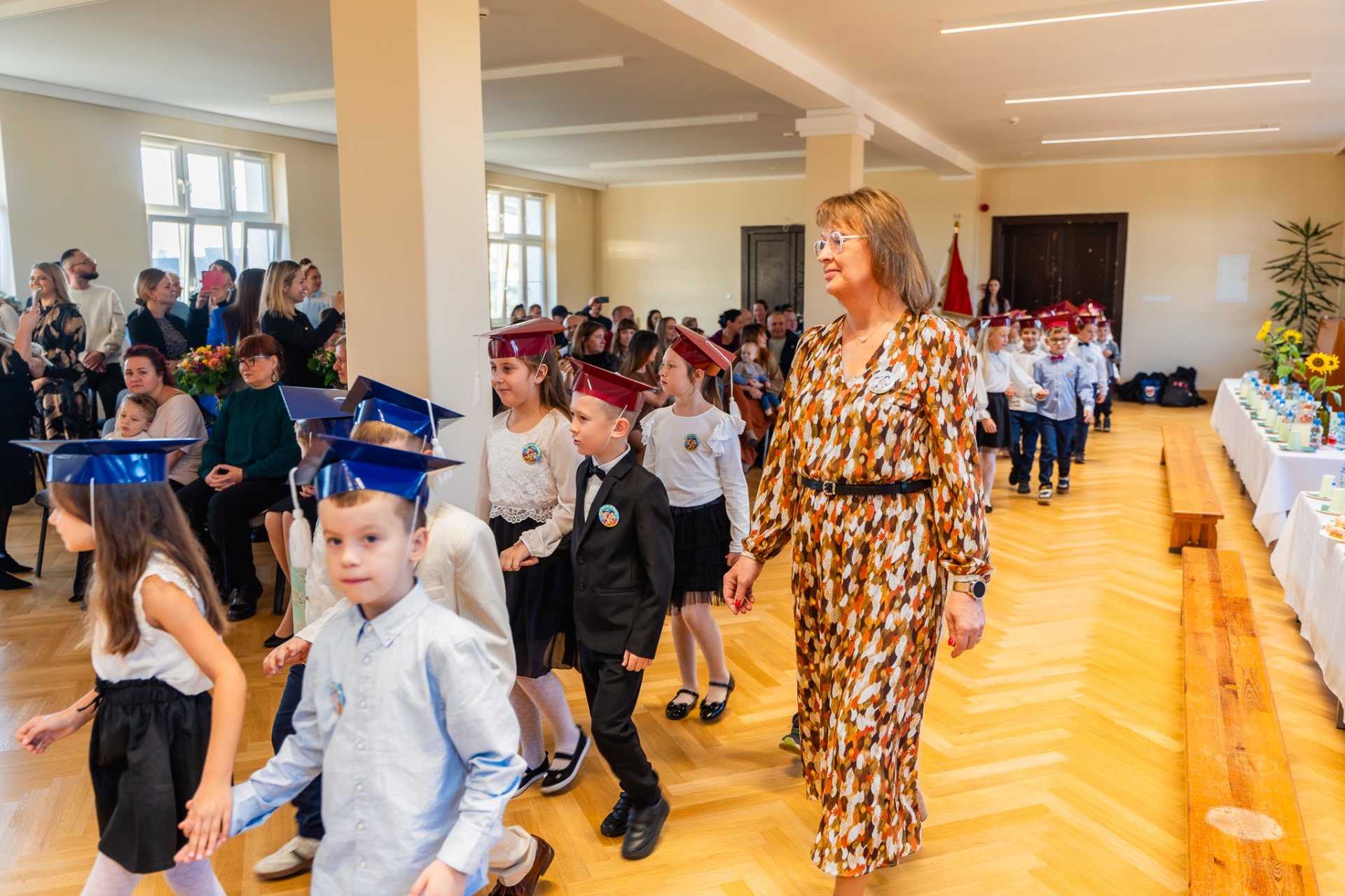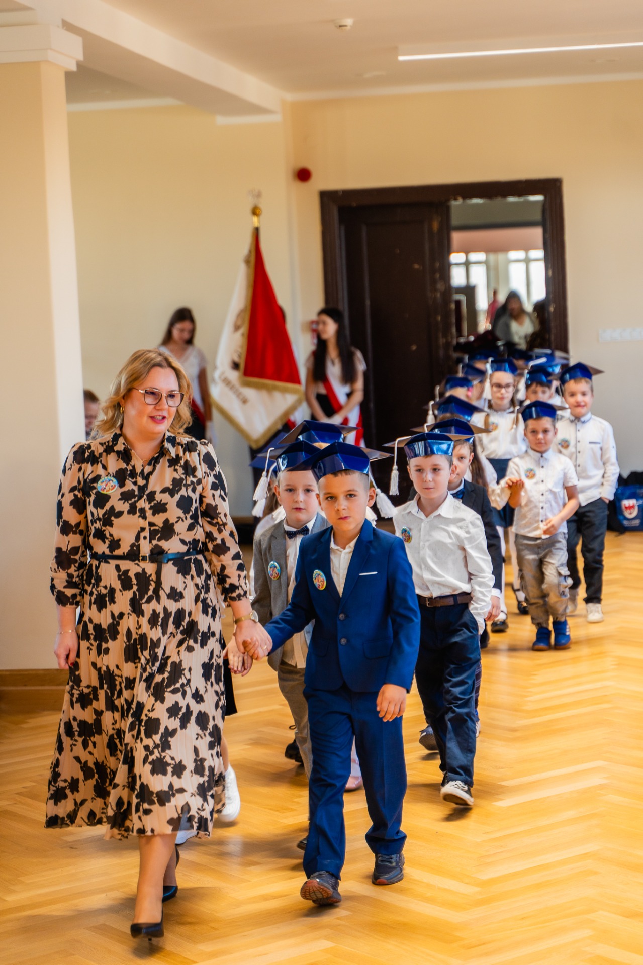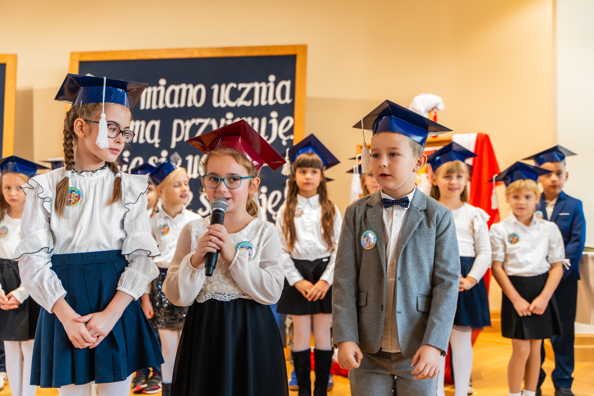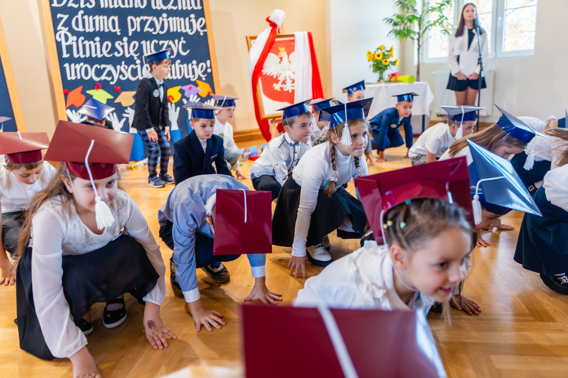 Mimo stresu związanego z publicznym występem, świetnie sobie poradzili w czasie uroczystości. W rytmie poloneza wkroczyli na salę. Bezbłędnie wyrecytowali wiersze i zaśpiewali piosenki. Wykazali się wiedzą i zręcznością oraz znajomością symboli narodowych, które z dumą prezentowali . Swoją postawą udowodnili, iż są gotowi do złożenia uroczystego ślubowania. Obiecali być pilnymi i wzorowymi uczniami, dobrymi kolegami, prawymi Polakami i godnie reprezentować dobre imię naszej szkoły. Swym zachowaniem i nauką sprawiać radość rodzicom i nauczycielom. Po złożeniu przyrzeczenia, pan dyrektor Kamilla Kwiręg dokonała aktu pasowania, który symbolizuje oficjalne przyjęcie w poczet uczniów Szkoły Podstawowej im. Marii Skłodowskiej-Curie w Ośnie Lubuskim. Każdy pierwszoklasista otrzymał pamiątkowy dyplom i upominki od zaproszonych gości. Ten miły i pełen niezapomnianych wrażeń dzień zakończył się słodkim poczęstunkiem przygotowanym przez rodziców i z pewnością pozostanie w pamięci dzieci na długo.