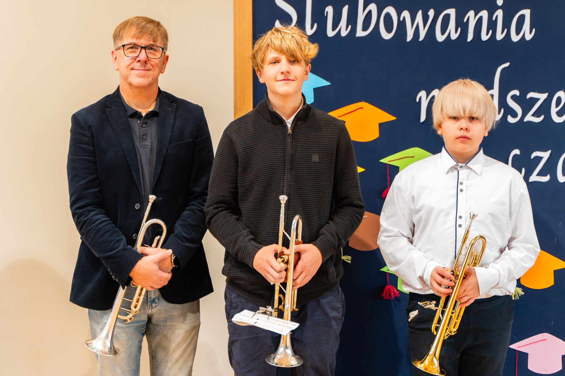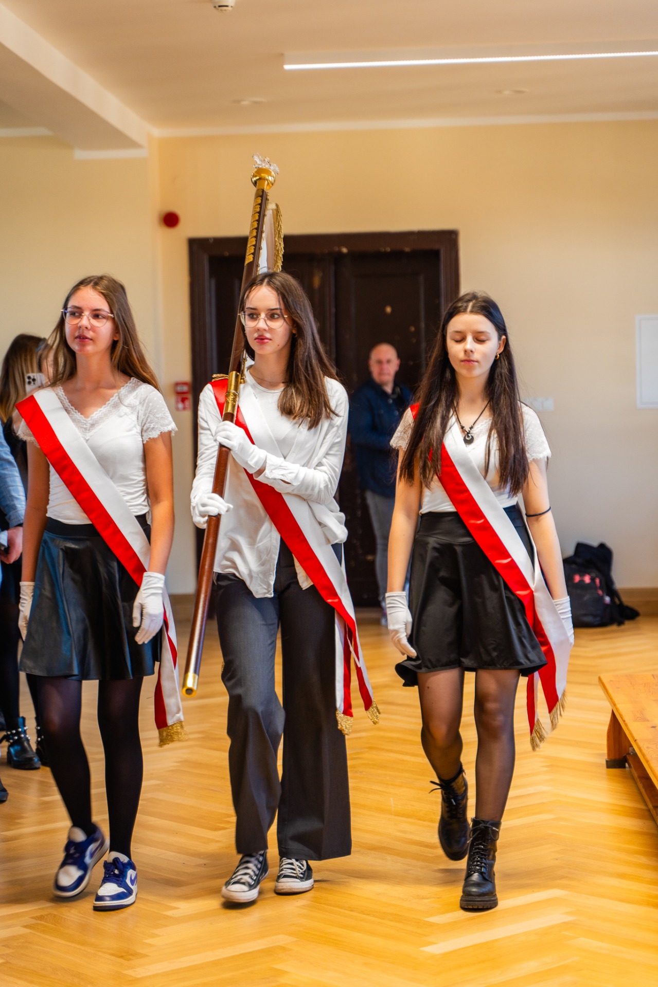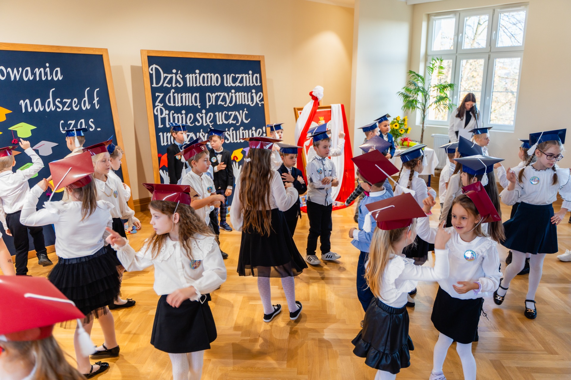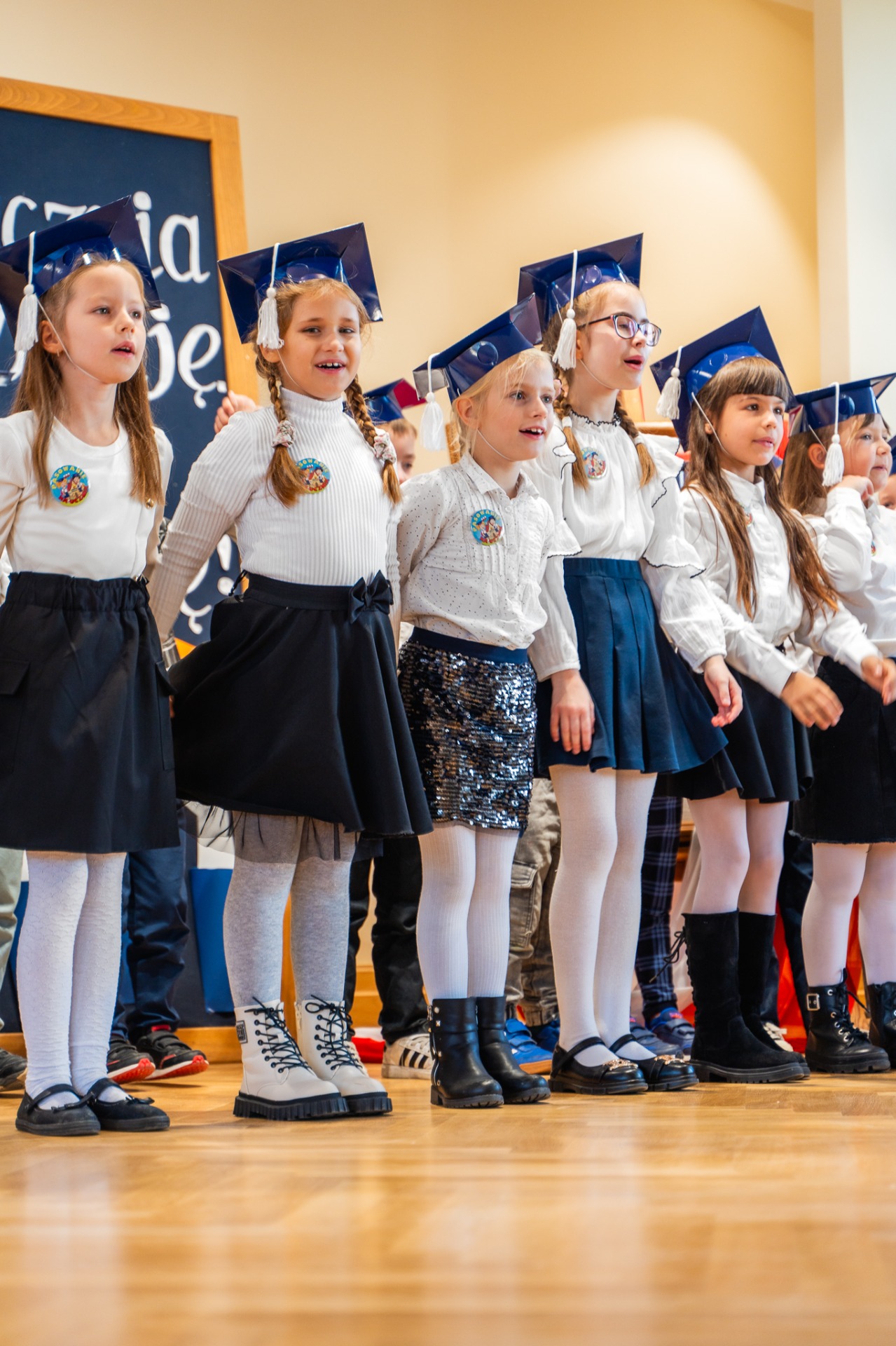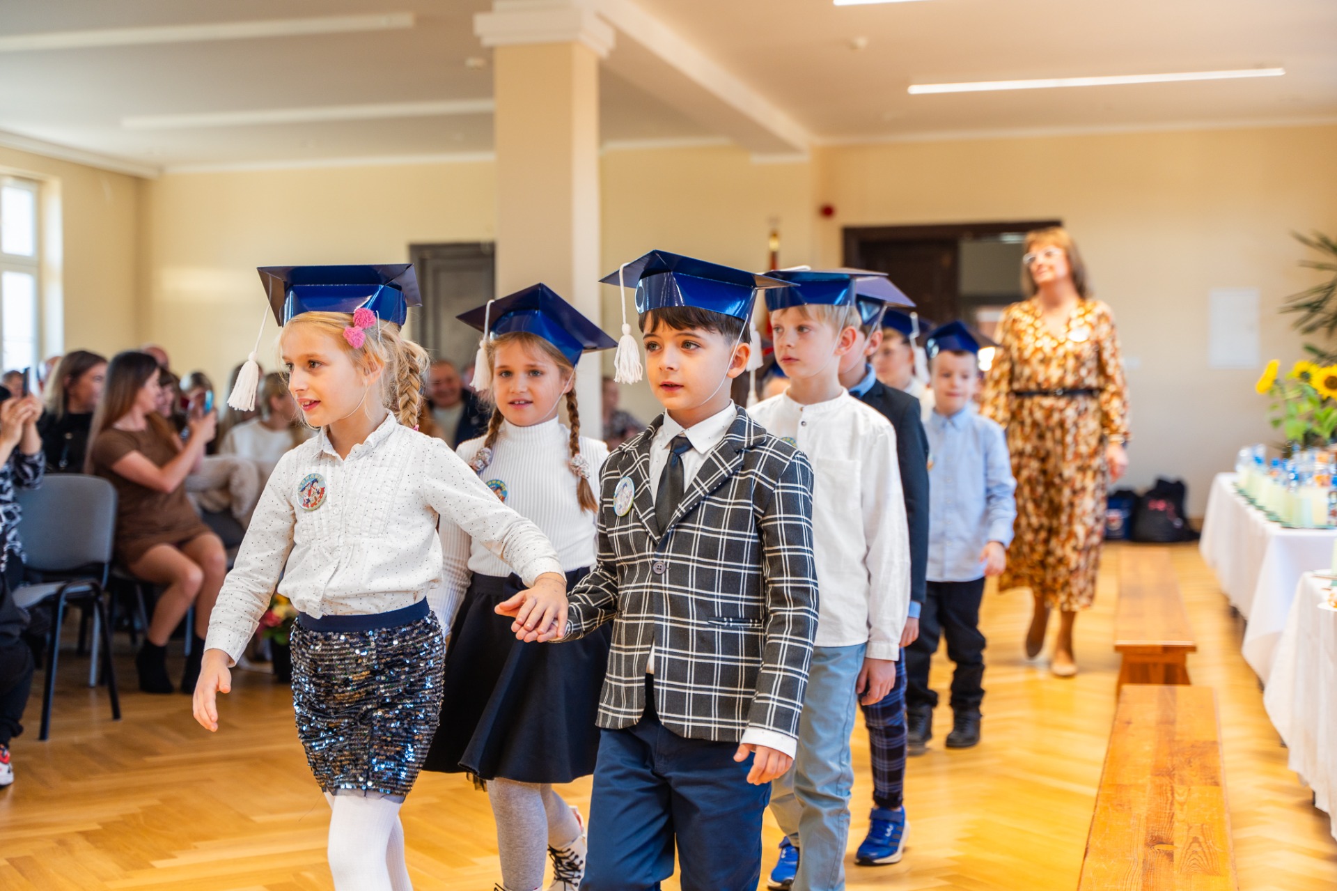Mimo stresu związanego z publicznym występem, świetnie sobie poradzili w czasie uroczystości. W rytmie poloneza wkroczyli na salę. Bezbłędnie wyrecytowali wiersze i zaśpiewali piosenki. Wykazali się wiedzą i zręcznością oraz znajomością symboli narodowych, które z dumą prezentowali . Swoją postawą udowodnili, iż są gotowi do złożenia uroczystego ślubowania. Obiecali być pilnymi i wzorowymi uczniami, dobrymi kolegami, prawymi Polakami i godnie reprezentować dobre imię naszej szkoły. Swym zachowaniem i nauką sprawiać radość rodzicom i nauczycielom. Po złożeniu przyrzeczenia, pan dyrektor Kamilla Kwiręg dokonała aktu pasowania, który symbolizuje oficjalne przyjęcie w poczet uczniów Szkoły Podstawowej im. Marii Skłodowskiej-Curie w Ośnie Lubuskim. Każdy pierwszoklasista otrzymał pamiątkowy dyplom i upominki od zaproszonych gości. Ten miły i pełen niezapomnianych wrażeń dzień zakończył się słodkim poczęstunkiem przygotowanym przez rodziców i z pewnością pozostanie w pamięci dzieci na długo.