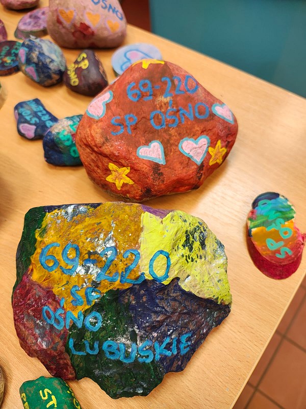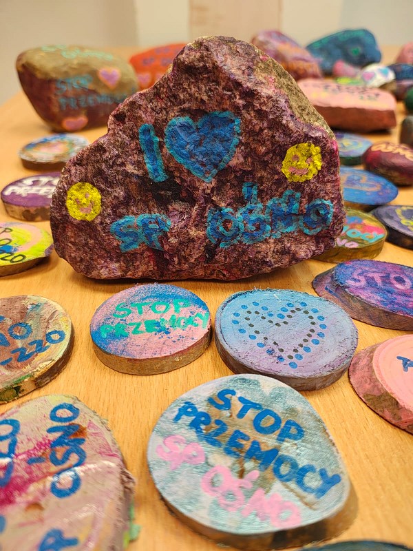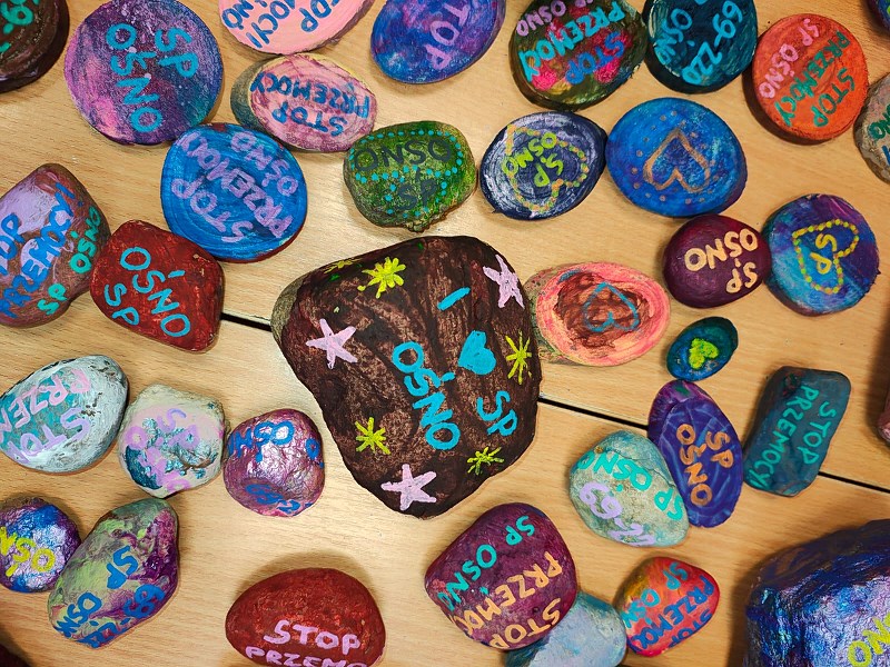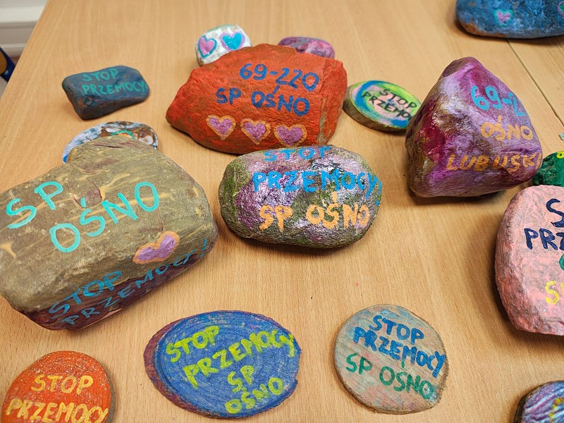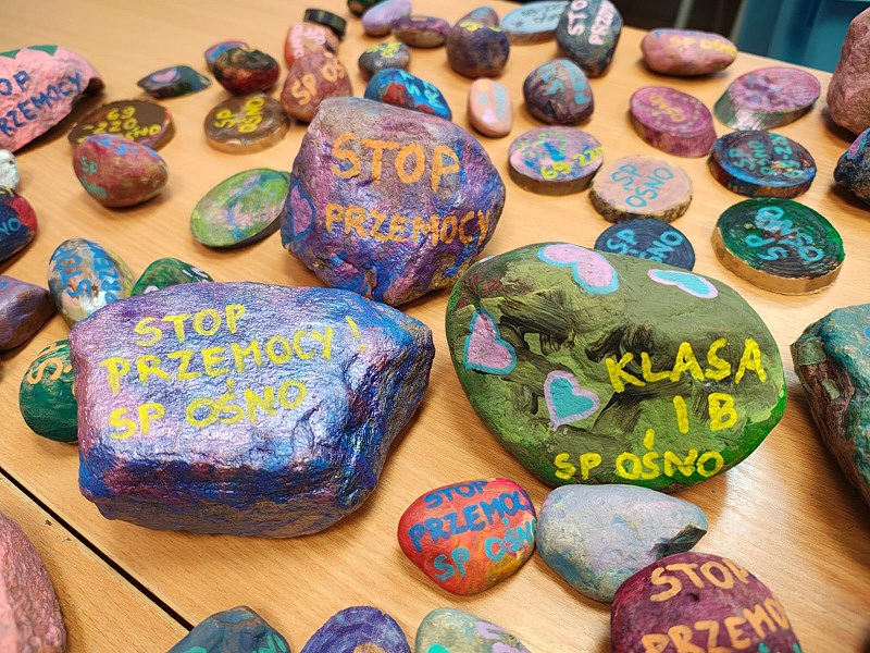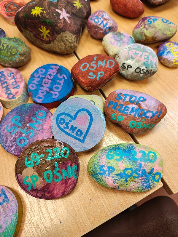 W ramach ogólnopolskiej kampanii Dzieciństwo bez Przemocy, której inicjatorem jest Fundacja Dajemy Dzieciom Siłę, uczniowie klas 0 – III ozdobili kamienie i drewniane krążki specjalnymi farbami. Dzieci podczas zajęć dowiedziały się jakie są rodzaje przemocy, w jaki sposób zareagować, gdy są świadkami niewłaściwych zachować i do kogo mogą się zwrócić o pomoc. Uczniowie pomalowali kamienie/drewniane krążki w ramach sprzeciwu wobec przemocy, które zostaną następnie rozłożone w różnych miejscach Ośna i w innych miejscowości. Zachęcamy do podzielenia się informacją, jeżeli dzieciom i rodzicom uda się znaleźć skarby, przygotowanie w ramach kampanii.