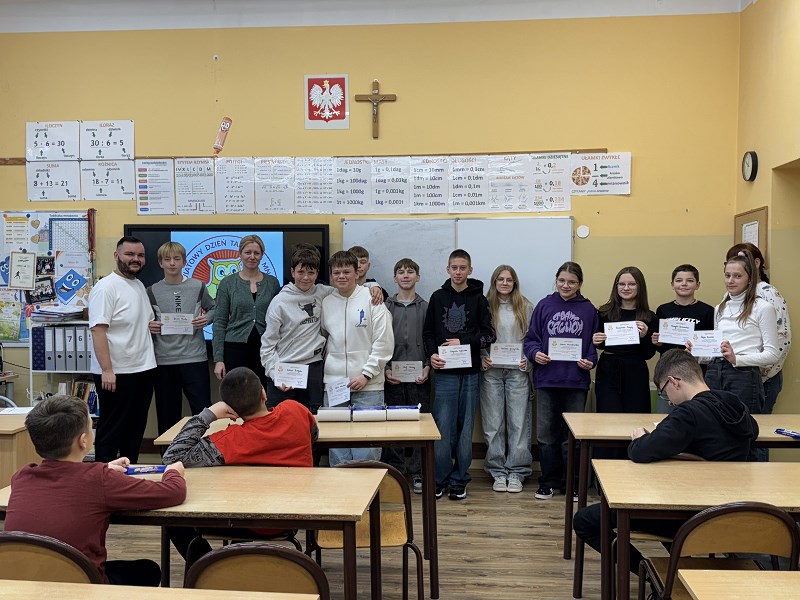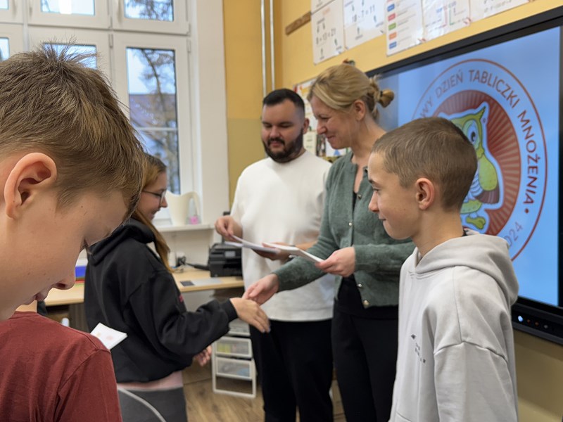 Nasi uczniowie po raz kolejny udowodnili, że matematyczne wyzwania nie są im straszne. Aż 55 osób podjęło wyzwanie i wzięło udział w konkursie z okazji Światowego Dnia Tabliczki Mnożenia obchodzonego 15.11.2024r. W pierwszej części uczestnicy zmierzyli się z egzaminem z tabliczki mnożenia, w drugiej natomiast z łamigłówkami i zadaniami logicznymi związanymi z mnożeniem i dzieleniem. Wszyscy uczniowie uzyskali certyfikat Mistrza Tabliczki Mnożenia, a trzem osobom udało się rozwiązać bezbłędnie wszystkie zadania, za co zostali nagrodzeni matematycznymi upominkami.