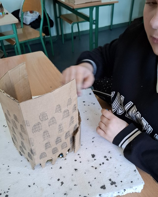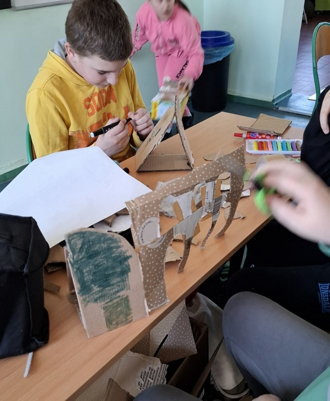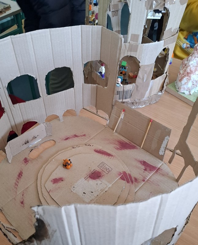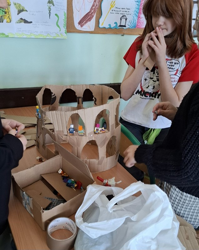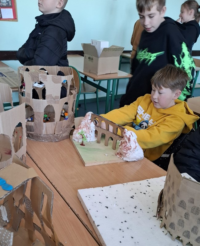 Już od pierwszych chwil lekcji w klasie panowała atmosfera wielkiego entuzjazmu. Uczniowie zabrali się do pracy z ogromnym zaangażowaniem: wycinali kartonowe arkusze, formowali łuki, kleili elementy i ozdabiali je różnymi detalami. Największe emocje wzbudzały modele Koloseum, w których nie tylko odtworzono charakterystyczne łukowe arkady, ale i zaprezentowano to, co działo się w jego wnętrzu. Nie zabrakło kartonowej publiczności, dzikich zwierząt, a nawet scen z bitew morskich, jakie w starożytności urządzano na specjalnie zalanej arenie!