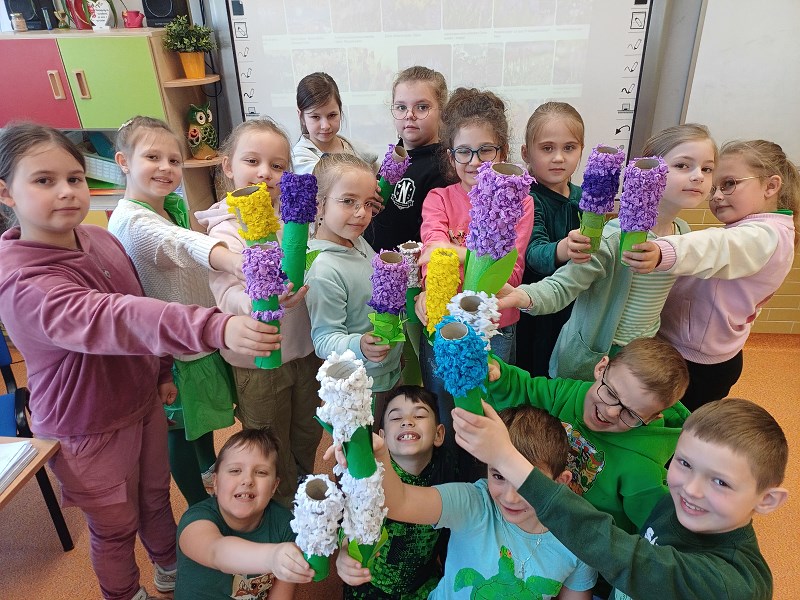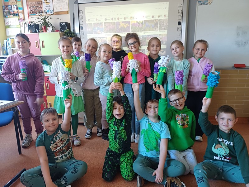 Prawdziwy miłośnik przyrody musi zobaczyć, powąchać, dotknąć - podobnie jest z dziećmi z klasy 2c, które postanowiły poszukać nadchodząca wiosnę. Razem ze swoją panią, uczniowie wybrali się na spacer. Okazało się, że wiosna jest wokół naszej szkoły. Piękne przebiśniegi, krokusy, zawilce, a nawet sasanki zachwyciły dzieci swoim urokiem. Uczniowie doskonale wiedzą, że pierwsze wiosenne kwiaty są pod ochroną, dlatego nie wolno ich zrywać, ale można zrobić im zdjęcia. Dzieci zainspirowane pięknem nadchodzącej wiosny, postanowiły udekorować swoją pracownię kolorowymi, bibułkowymi hiacyntami. Teraz wiosnę mamy w zasięgu wzroku i na wyciągnięcie ręki - tak jak prawdziwi przyrodnicy.