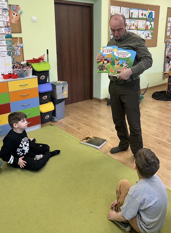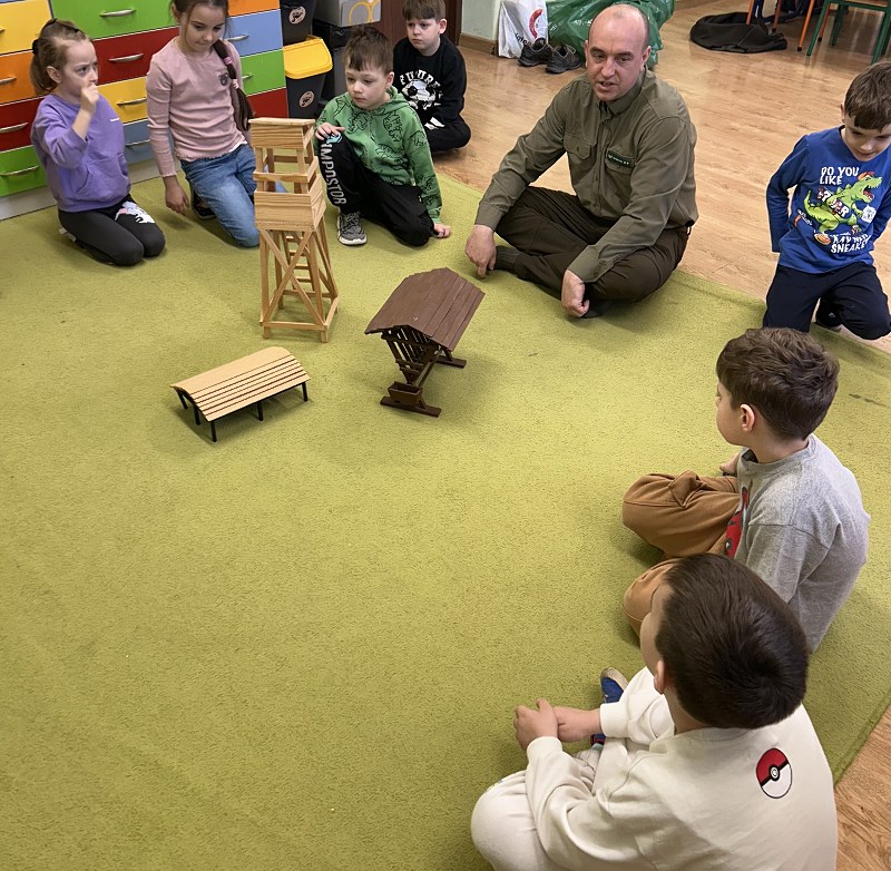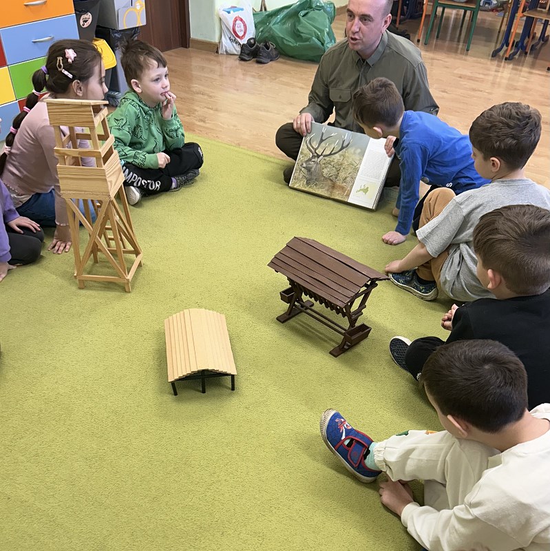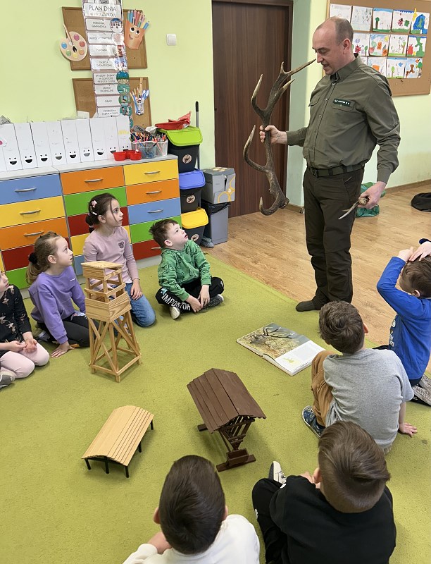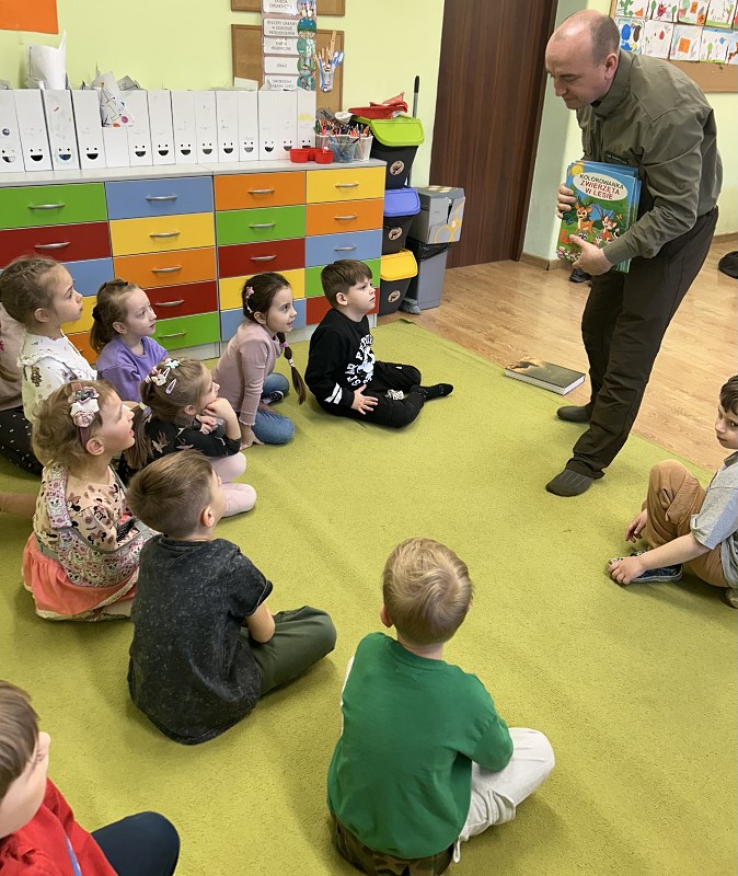 Podleśniczy przybliżył także fascynujący świat zwierząt zamieszkujących nasze lasy. Opowiadał o ich zwyczajach, sposobach przystosowania się do różnych warunków oraz o tym, jak ludzie mogą pomagać im przetrwać trudniejsze pory roku. Przedszkolaki miały mnóstwo pytań, na które nasz gość chętnie i cierpliwie odpowiadał.