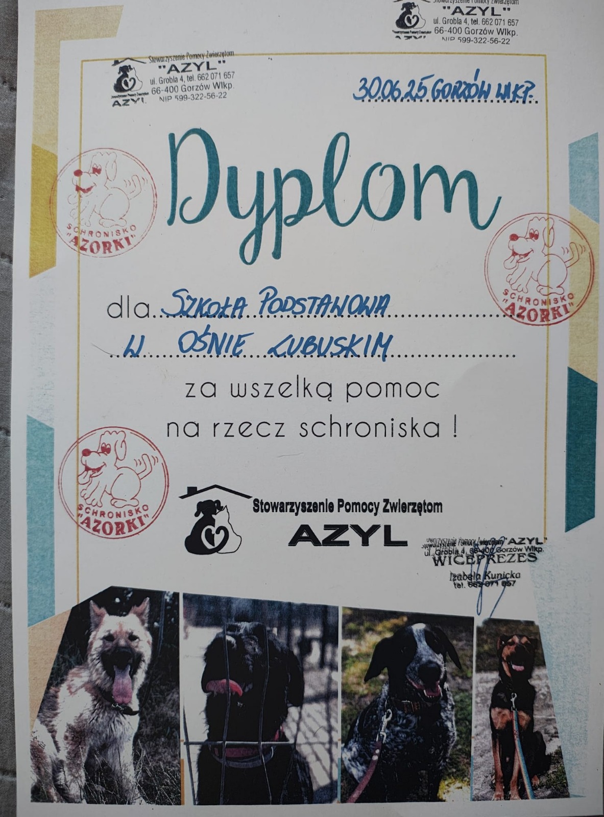 W porozumieniu z rodzicami dzieci zorganizowały akcję „Zamiast kwiatka – paczka dla zwierzaczka”. Wychowawczyni, pani Anna Molsa, skontaktowała się ze Stowarzyszeniem Pomocy Zwierzętom AZYL, które prowadzi schronisko „Azorki” w Gorzowie Wielkopolskim. Pracownicy byli mile zaskoczeni pomysłem młodzieży i wskazali, co przydałoby się aktualnie w schronisku. I tak 27 czerwca uczniowie zakończyli rok szkolny 2024/2025 i jednocześnie podarowali ogromną porcję wartościowej karmy dla psów i kotów w gorzowskim schronisku. Warto dodać, że do inicjatywy klasy IV a dołączyli też uczniowie i wychowawcy innych klas, dzięki czemu zbiórka błyskawicznie się powiększyła. 30 czerwca dary trafiły do Azorków. Pracownicy byli zaskoczeni hojnością i dobrym sercem naszych uczniów.