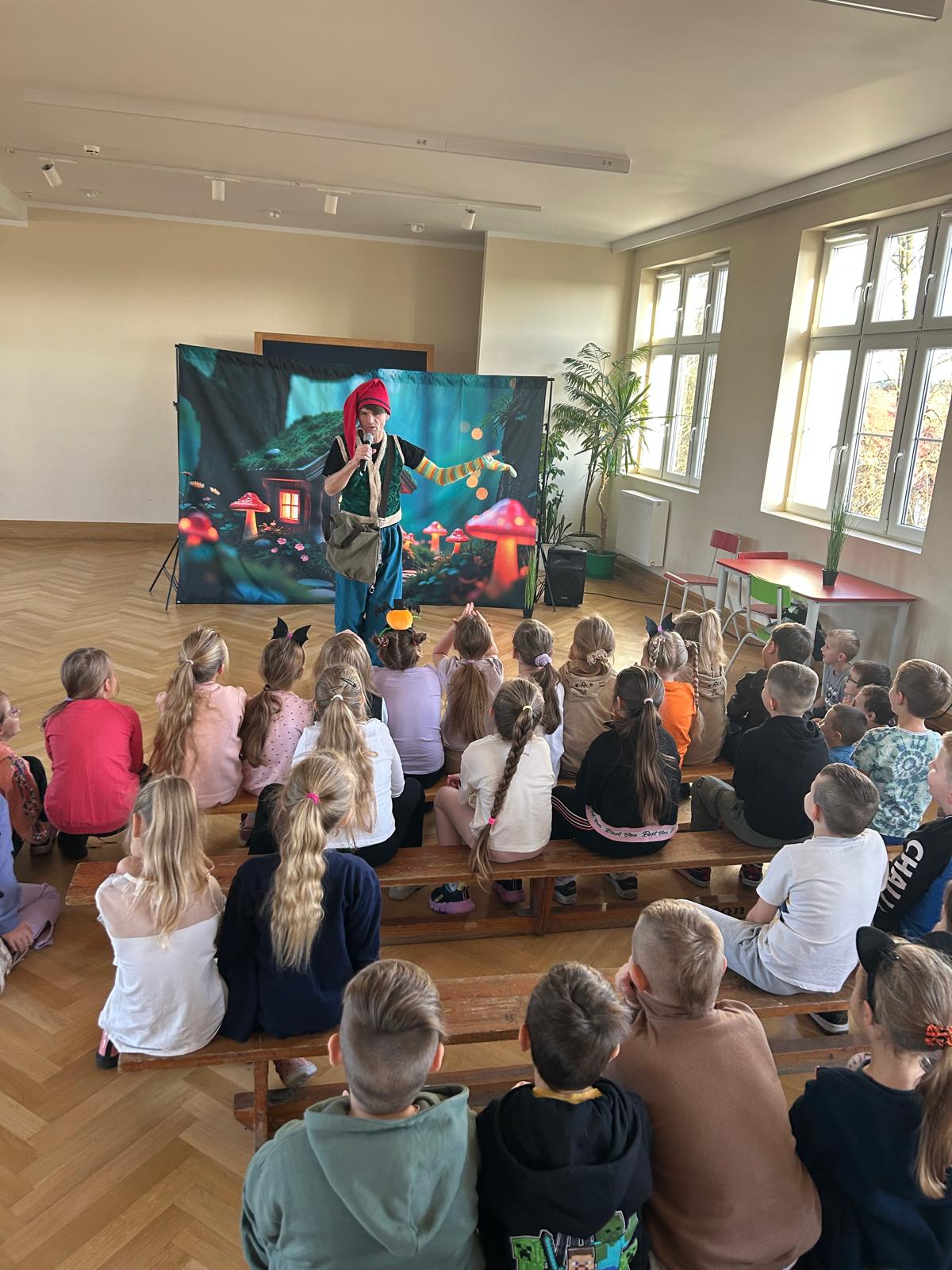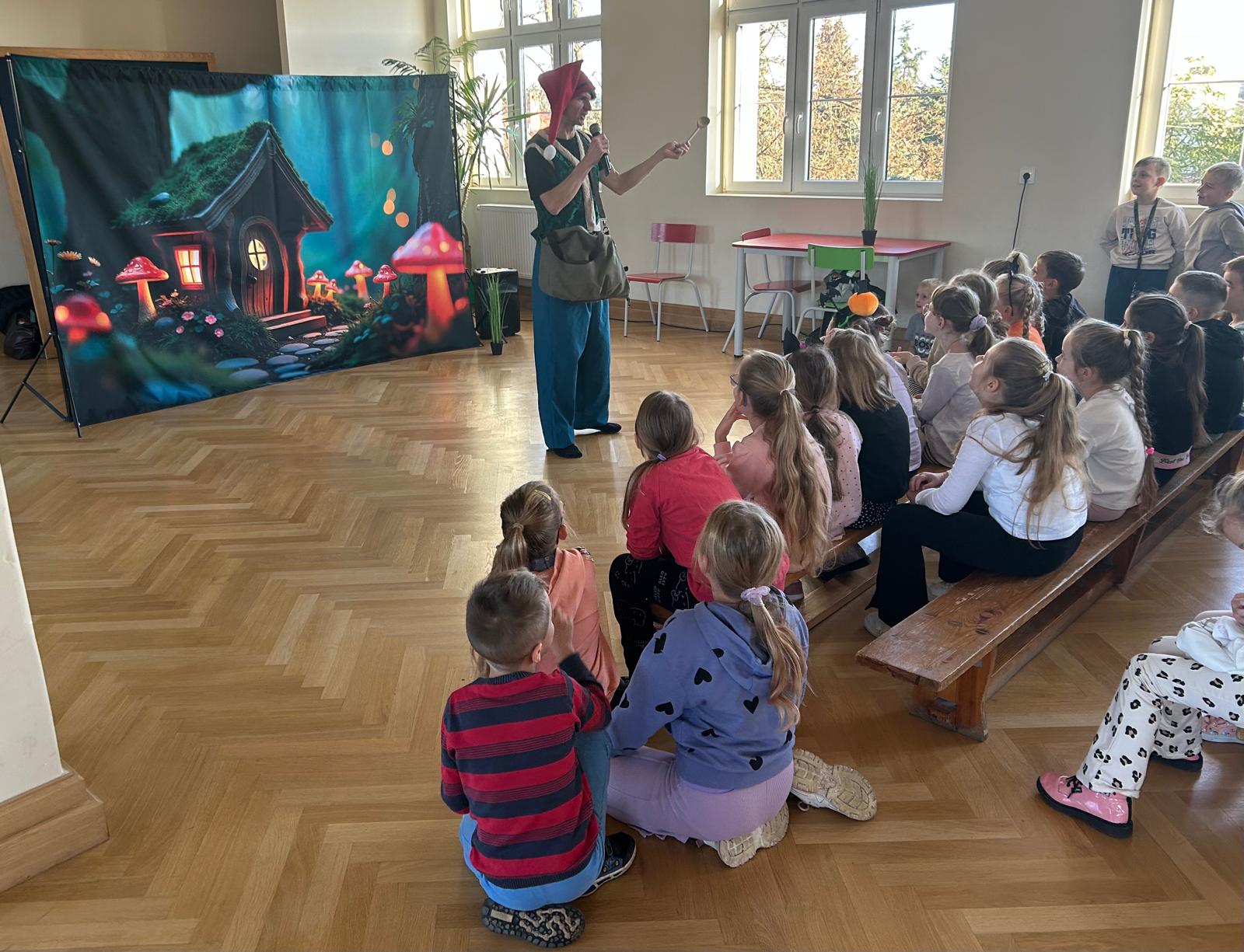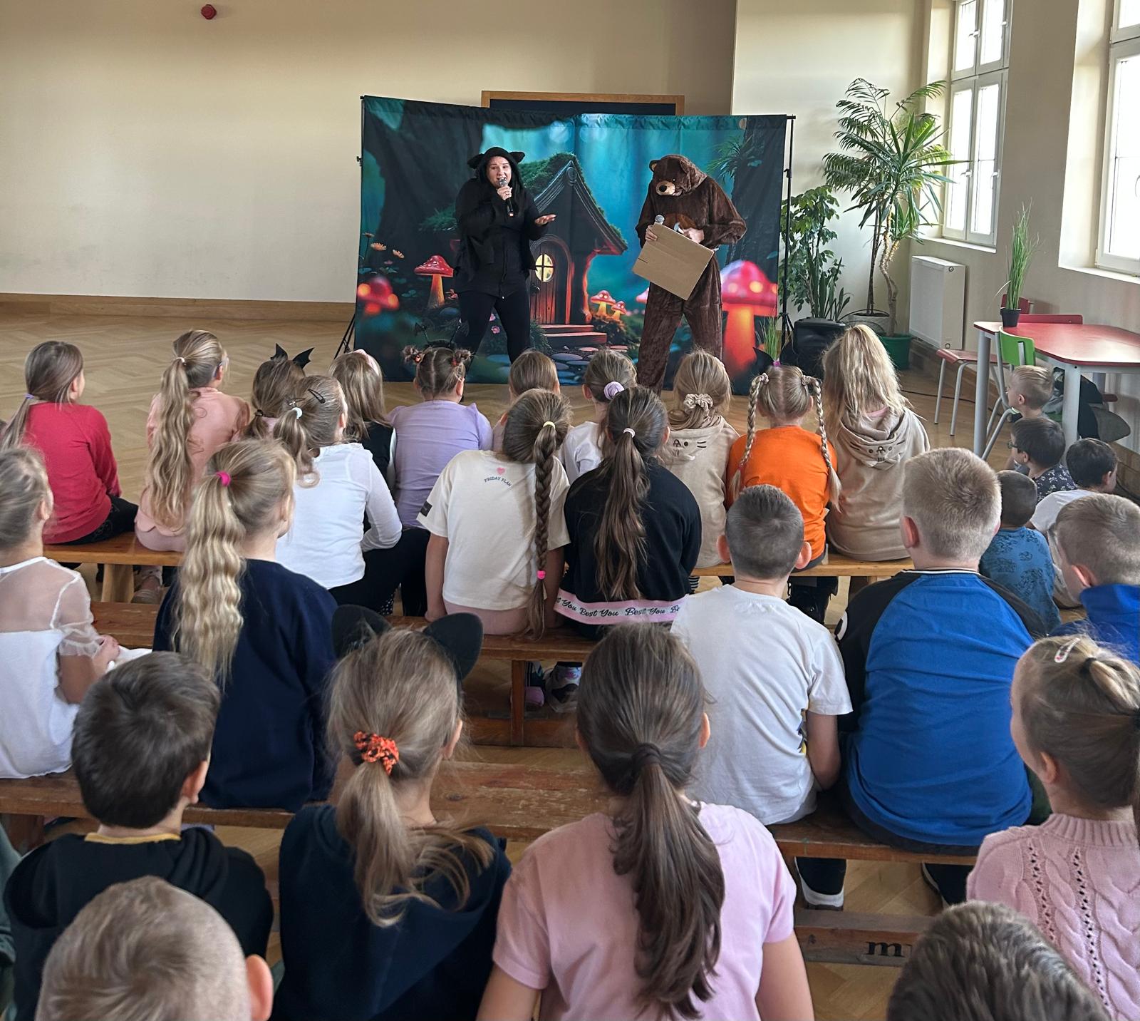 31 października 2025 do szkoły przyjechała Grupa T z Torunia. To już kolejny raz kiedy nasza młodzież miała okazję oglądać spektakle profilaktyczno – edukacyjne w wykonaniu zaprzyjaźnionych ze szkołą aktorów. Tym razem uczniowie klas pierwszych aktywnie uczestniczyli w przedstawieniu pt. „Co w uszach gra?”. Dzieci udały się w podróż do świata pełnego humoru i wspólnej zabawy. Krasnoludek Niezabudka i Nietoperzyca Topcia odkryli zaczarowane uszy, które założone przez postronną osobę sprawiają, że słyszy ona więcej niż słowa. Dzięki temu sympatyczni bohaterowie przećwiczyli z widzami nazywanie